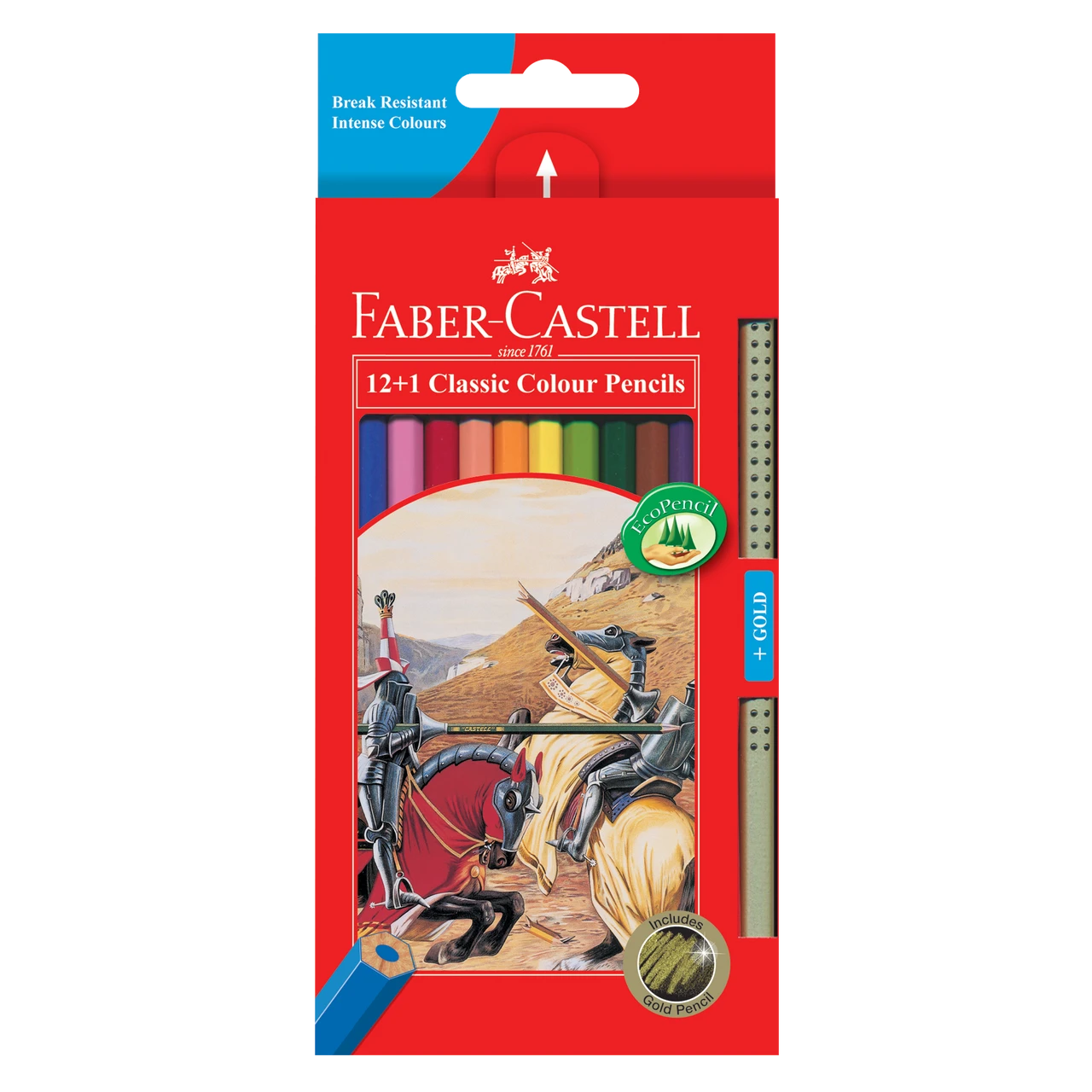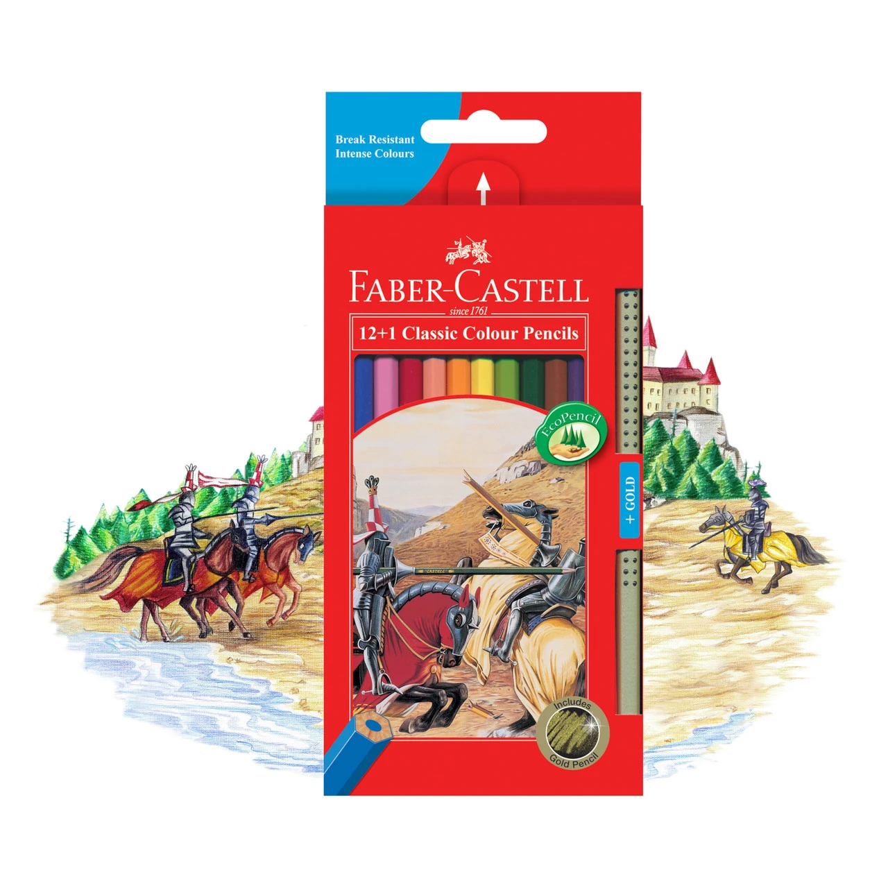 This pack includes 12 Faber-Castell Classic Colour Pencils and 1 bonus Gold Grip Colour Pencil in a durable wallet for easy storage.