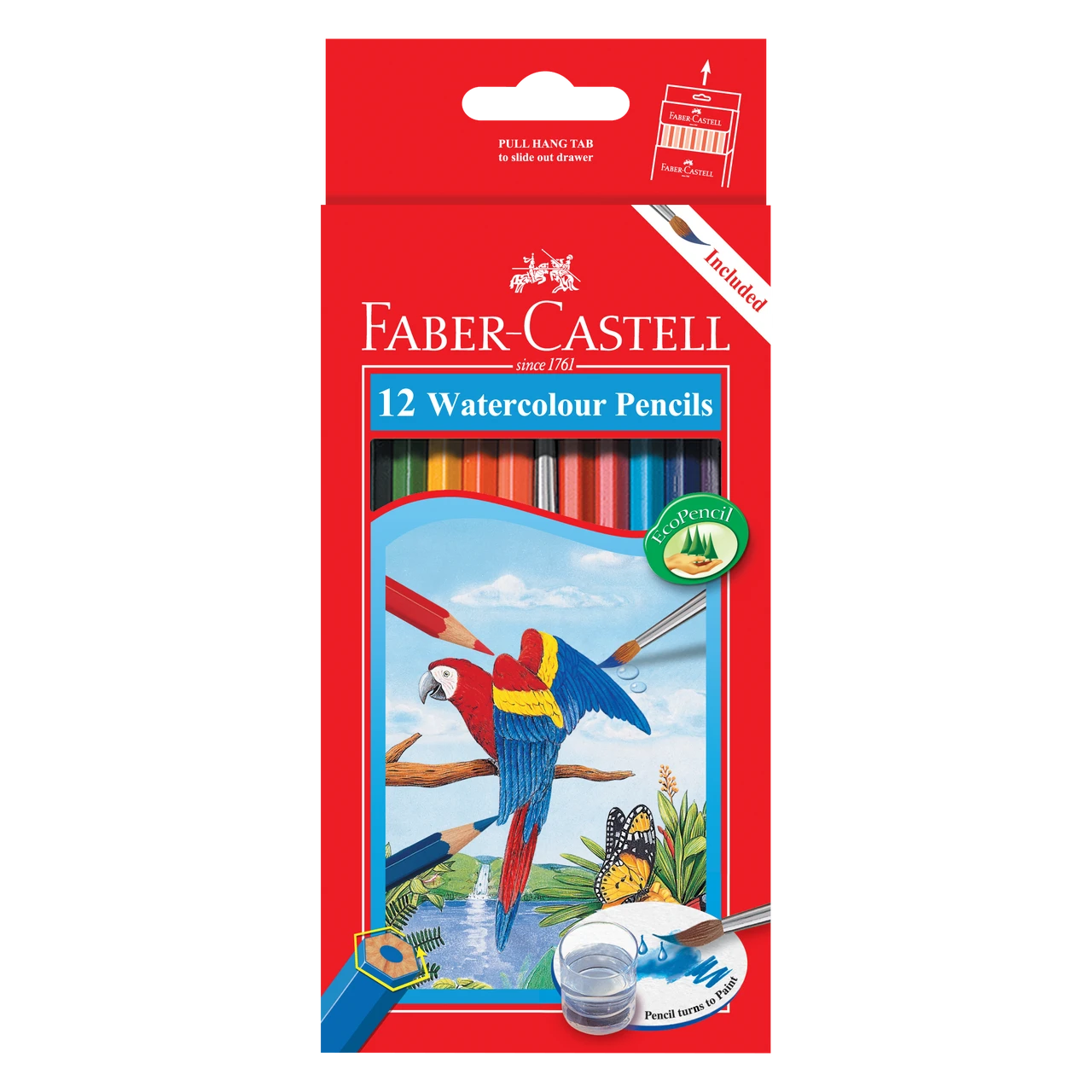 This pack includes 12 Faber-Castell Watercolour Pencils and 1 bonus paint brush in a durable wallet for easy storage.