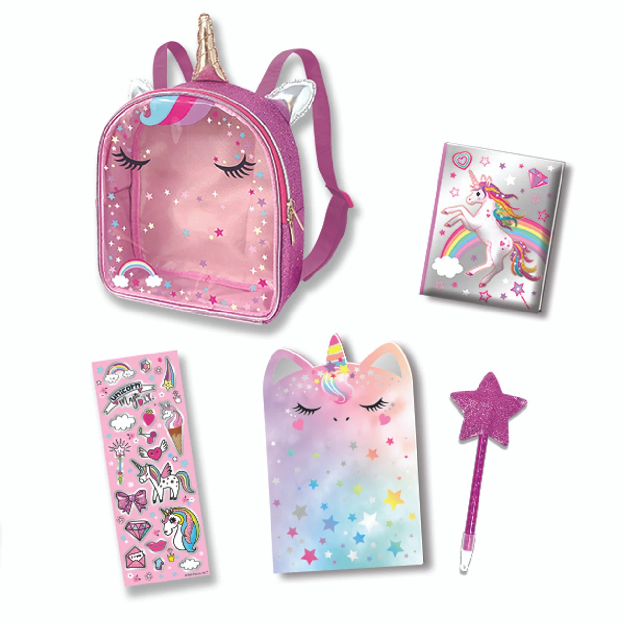 This trendy backpack is filled with all the fun stationaries you need on the go. Comes with one mini journal, notebook, scented stickers and a pom pom pen.