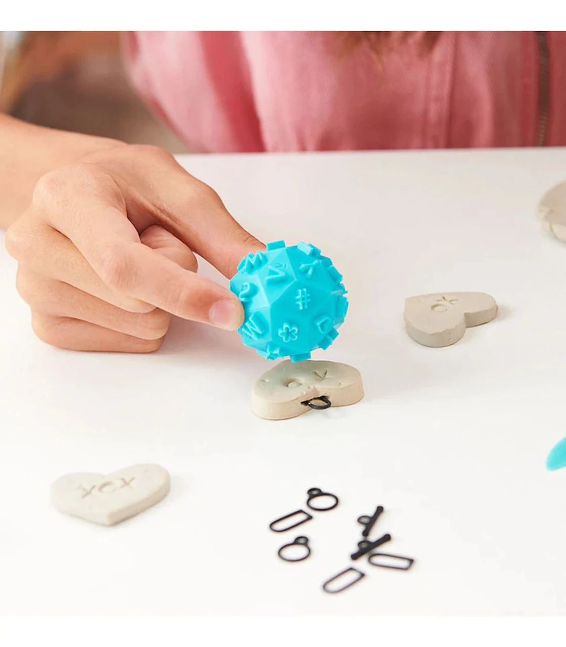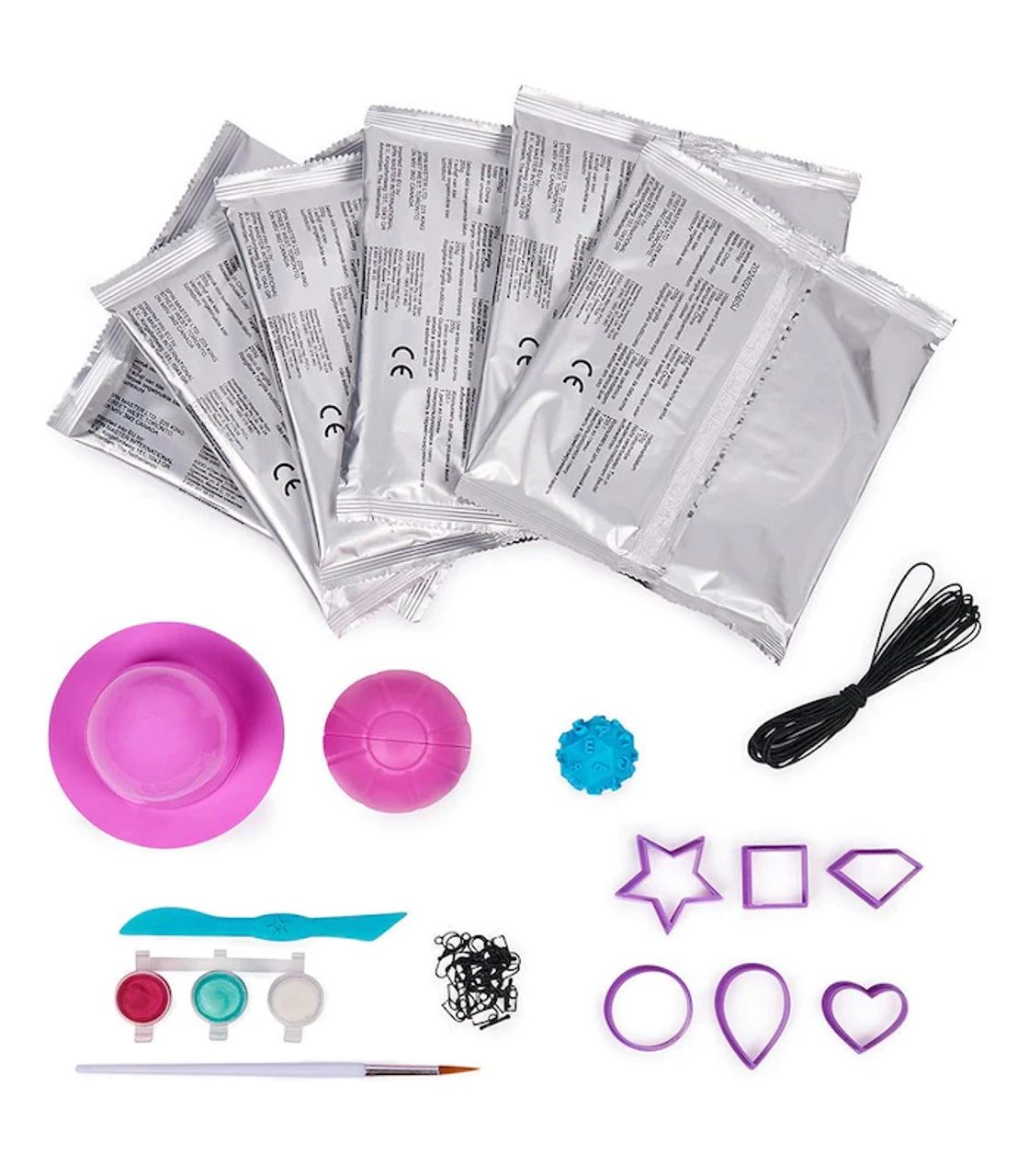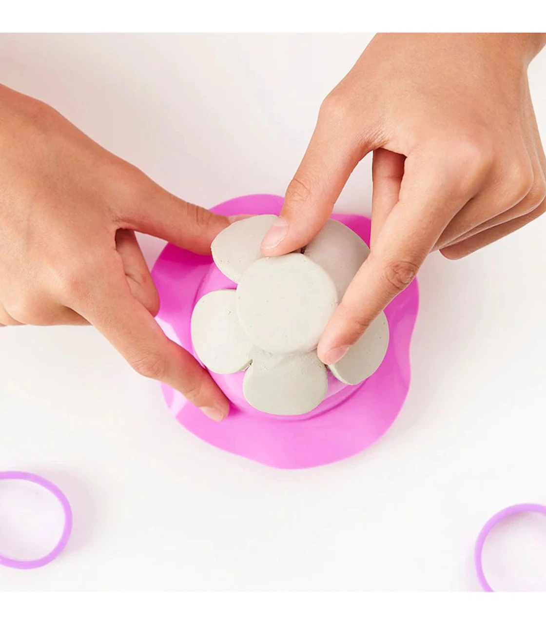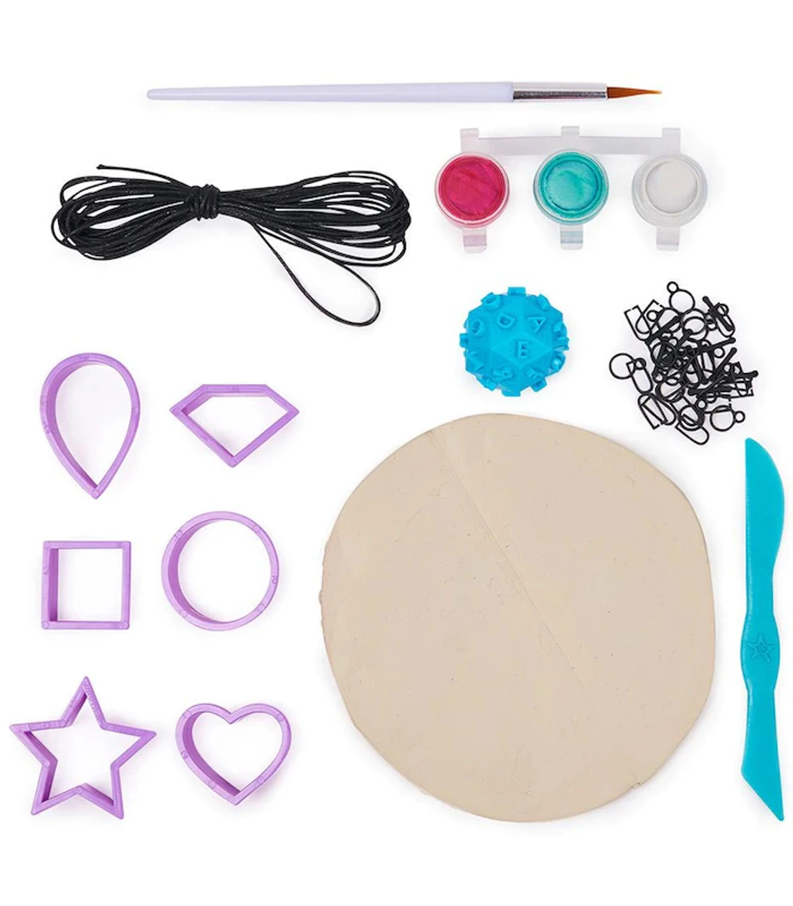 Make your own clay creations with the Cool Maker Clay Your Way Craft Kit! Featuring six easy-sculpt discs of air-dry clay for kids, three colours of paint, jewellery hooks and clasps, shape cutters and more, this DIY kit has everything you need to make stylish clay projects with no heat. Create a cactus jewellery tree, a cute flower jewellery bowl, trendy pendant necklace, two different rings and find more ideas on CoolMaker.com, or unleash your creativity to make your own designs! The kit’s tools and soft moulding clay discs make it so easy to create. Cut shapes in the clay with the cutters, use the core to help mould and shape, etch details with the blue tool, stamp letters or symbols with the letter stamp and so much more! For best results, dry creations overnight before painting. Style and customize any way you want with pink, blue and white metallic paint and add finishing details like string to make necklaces or bracelets! The Clay Your Way Craft Kit also works with the Cool Maker Pottery Studio pottery wheel (sold separately). For even more ways to express yourself with Cool Maker, sew your own fashions with the Stitch ‘N Style Fashion Studio and stamp stylish mani-pedi nail art with the GO GLAM U-nique Nail Salon nail stamper (each sold separately). Cool Maker girls’ toys and DIY crafts make great gifts for 8-year-old girls and up. They’re the perfect activities for a sleepover, birthday party, at-home spa day and more. Sculpt your own clay jewellery, décor, pottery, and more with the Cool Maker Clay Your Way Craft Kit!