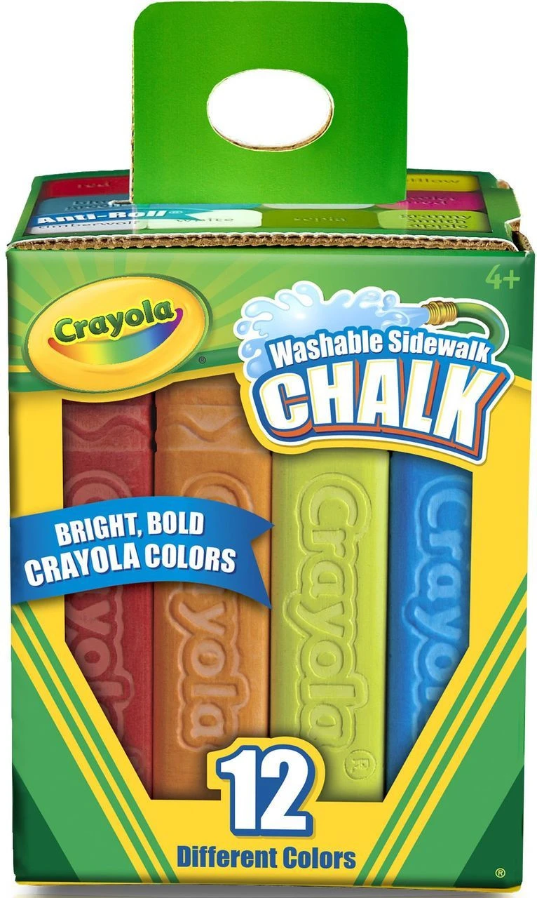 Create BIG outdoor art with the ONLY sidewalk chalk in bright, bold Crayola crayon colours! The Anti-Roll shape keeps sticks handy without rolling away and produces fine lines or broad strokes that simply wash away with water. Includes 12 Sidewalk Chalk sticks in exclusive Crayola crayon colours.