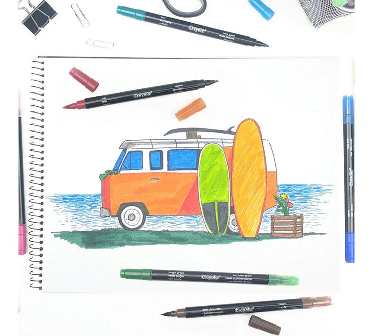 - Dual-ended markers feature a brush tip and ultra-fine tip for thick and thin lines.