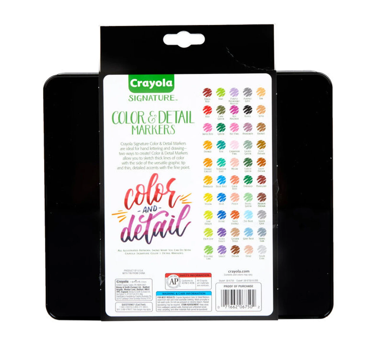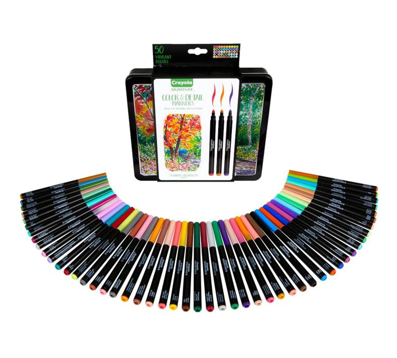 Create elegant works of art with Crayola Signature Color and Detail Markers! This sophisticated Signature Marker Set features 50 Art Markers in a range of beautiful, assorted colors. Choose from vibrant shades, dark hues, or subtle neutrals to add depth and highlights to your artwork! Specially designed tips make it easy to draw both thick or thin lines, color in large areas, or add intricate details. The Decorative Storage Tin is perfect for keeping your art supplies safe and organized or even putting them on display. Makes a great holiday or birthday gift for teenagers or adults who love to color!