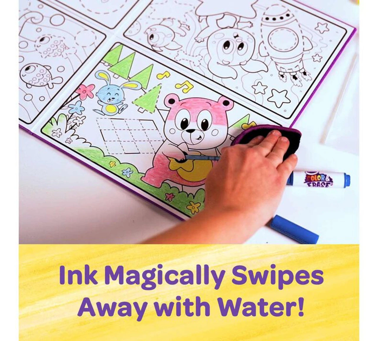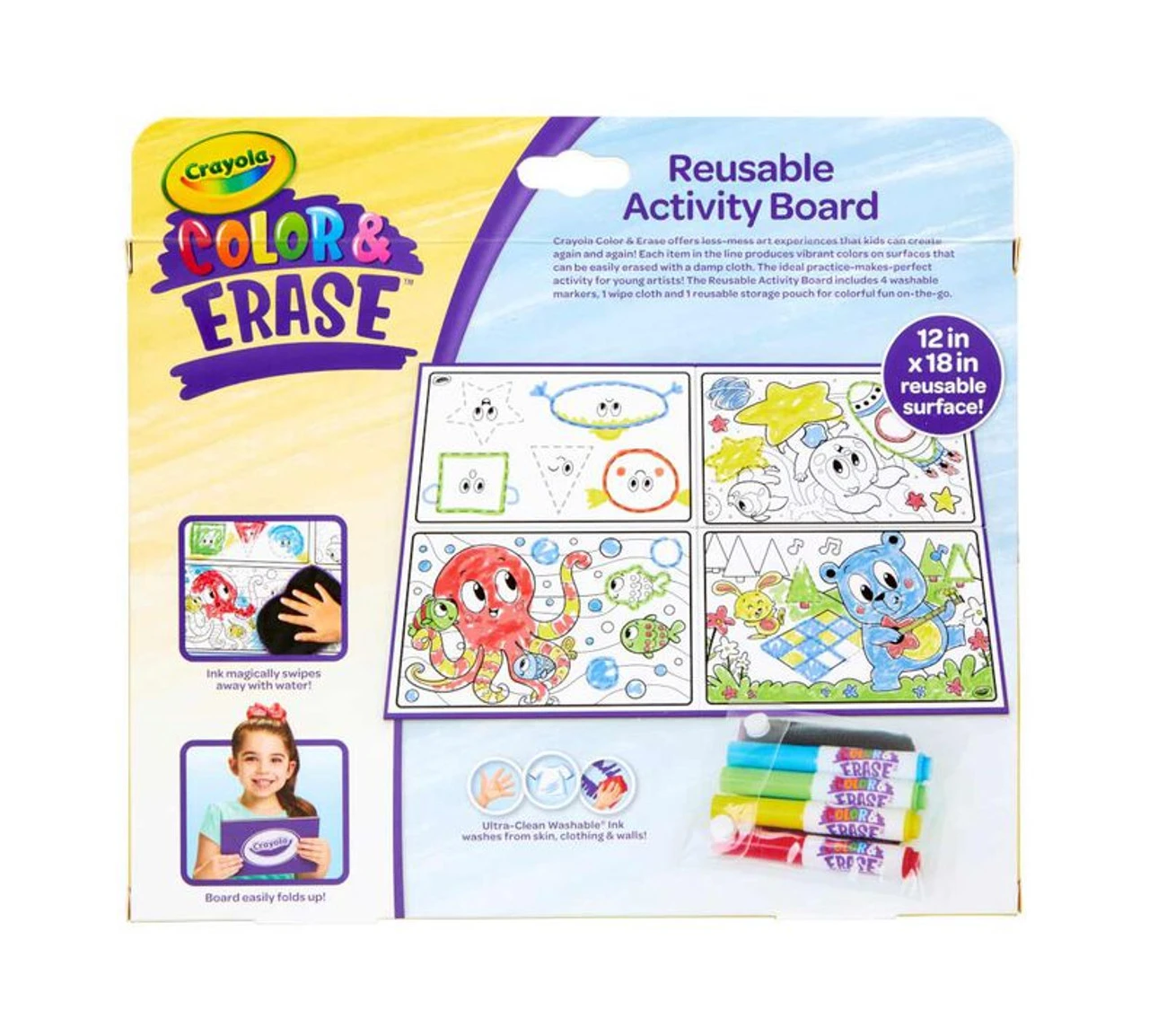 - CRAYOLA Colour & ERASE REUSABLE ACTIVITY BOARD: Includes 12″ x 18″ Reusable Activity Board, 4 Washable Markers, and 1 Wipe Cloth.
