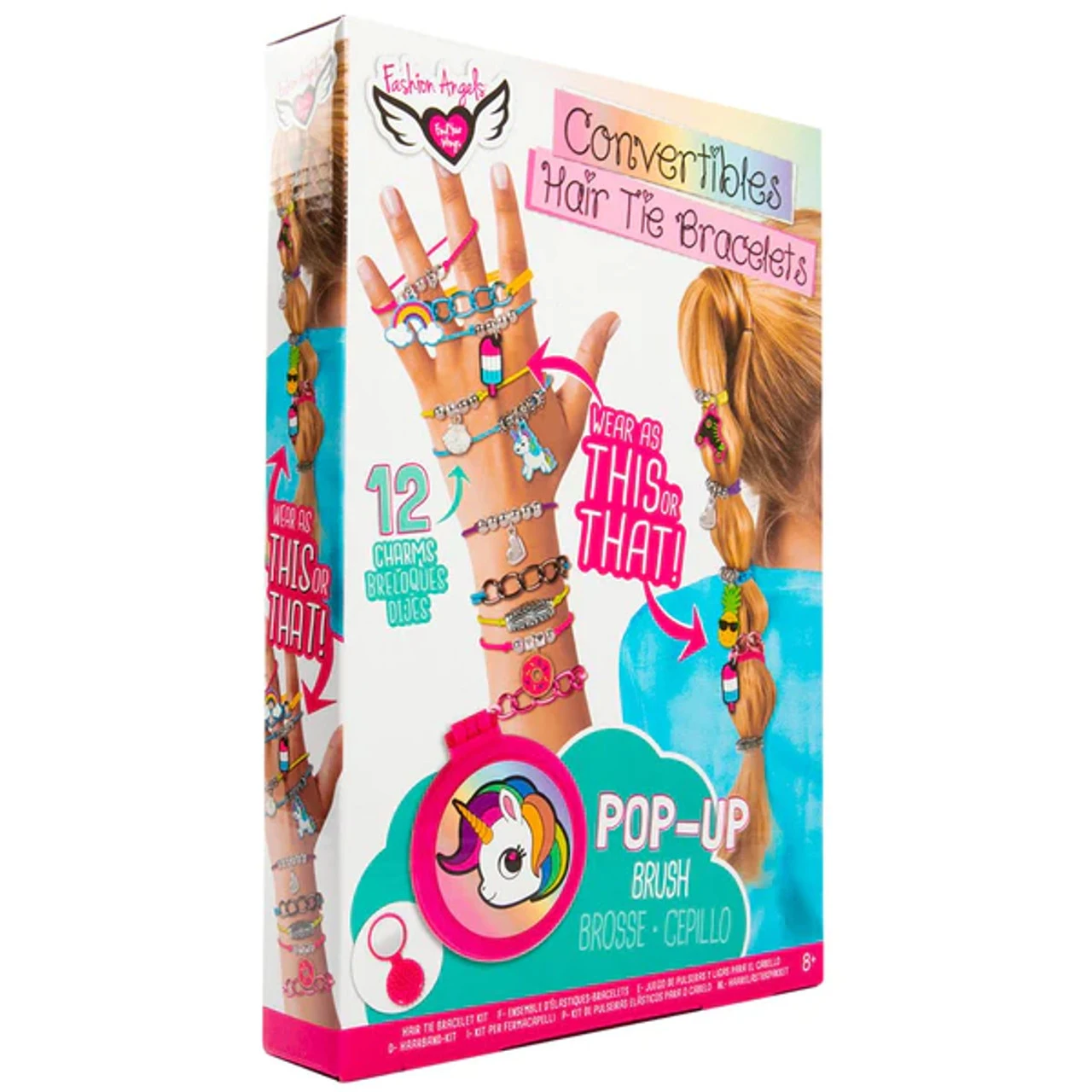 Kids can create cute and trendy hair ties with this Fashion Angels Convertibles Hair Tie Bracelet Kit! They can design and make up to 12 hair tie bracelets accented with charms, beads or chains; the choice is theirs. With this amazing kit, they can create cool combinations to wear both on their wrist and in their hair. They can share them with friends and use the included travel friendly pop-up brush and mirror to make sure their hair is on point! Includes: assorted beads (18g), 12 charms, 6 chain links, 8 colours of elastic cord, 15 silicone closures and instructions. Suitable for ages 8+.