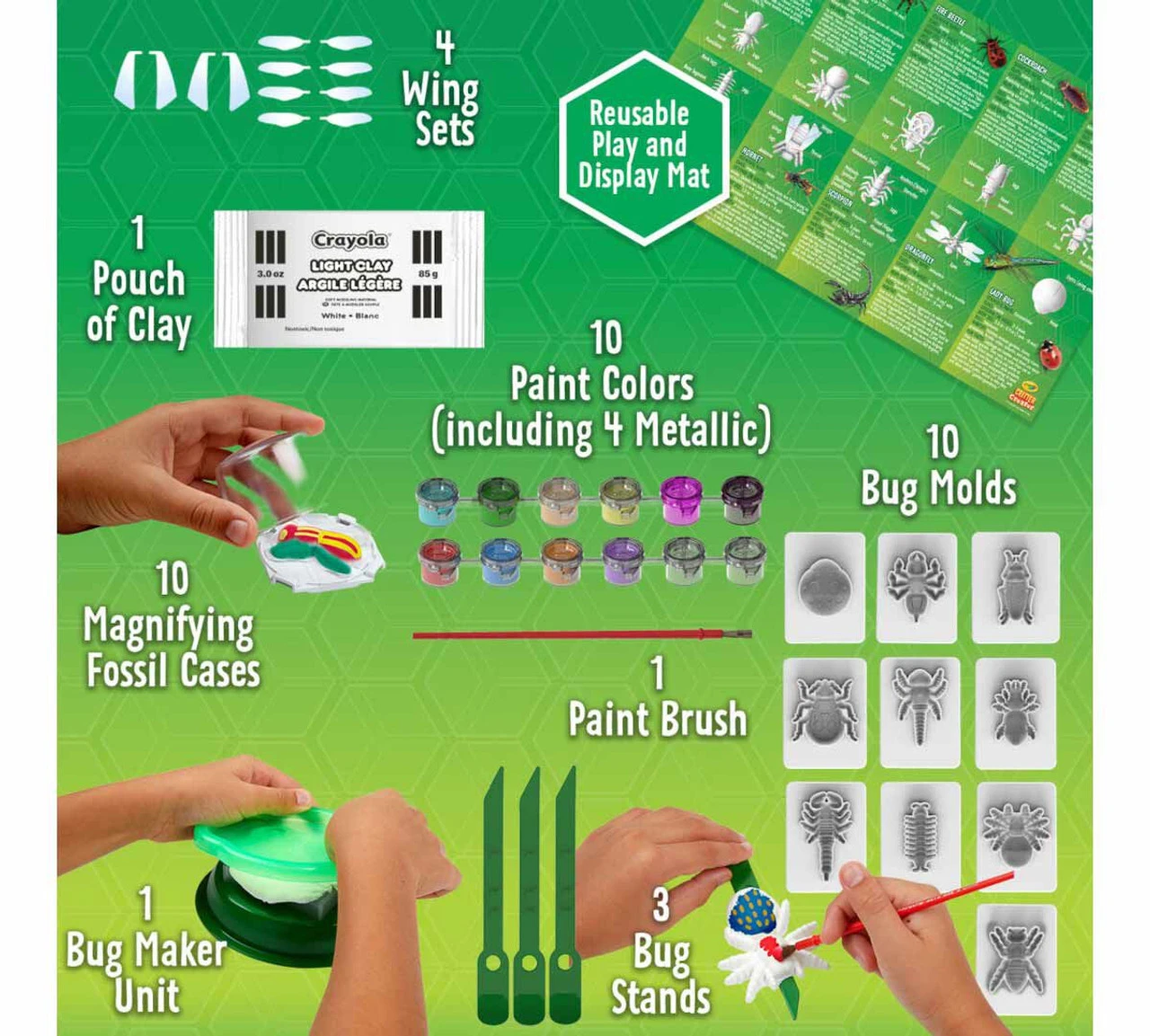 - CRITTER CREATOR METALLIC FOSSILS: Includes 1 Bug Maker Unit, 10 Bug Molds, 1 Pack of Light Clay (3 ounces total), 10 Fossil Cases, 3 Bug Stands, 6 Washable Paint Colours, 4 Specialty Metallic Paint Colours, 4 Sets of Bug Wings, 1 Paint Brush, 11″ x 17″ Display & play reusable bug FAQ Mat, Instructions.