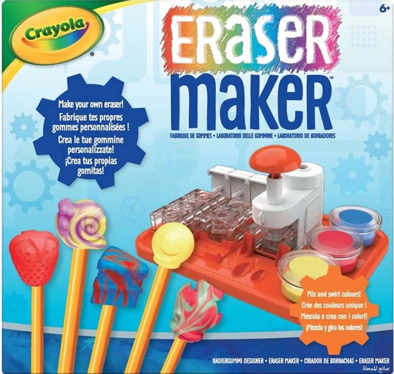 - PENCIL TOP ERASER CRAFT KIT: Includes Eraser Making Machine to make 20 erasers, (6) Eraser Making Moulds, (60g) White Base A, (20g) Part B Red, (20g) Part B Blue, (20g) Part B Yellow, (3) #2 Crayola Pencils, and Instruction Booklet.