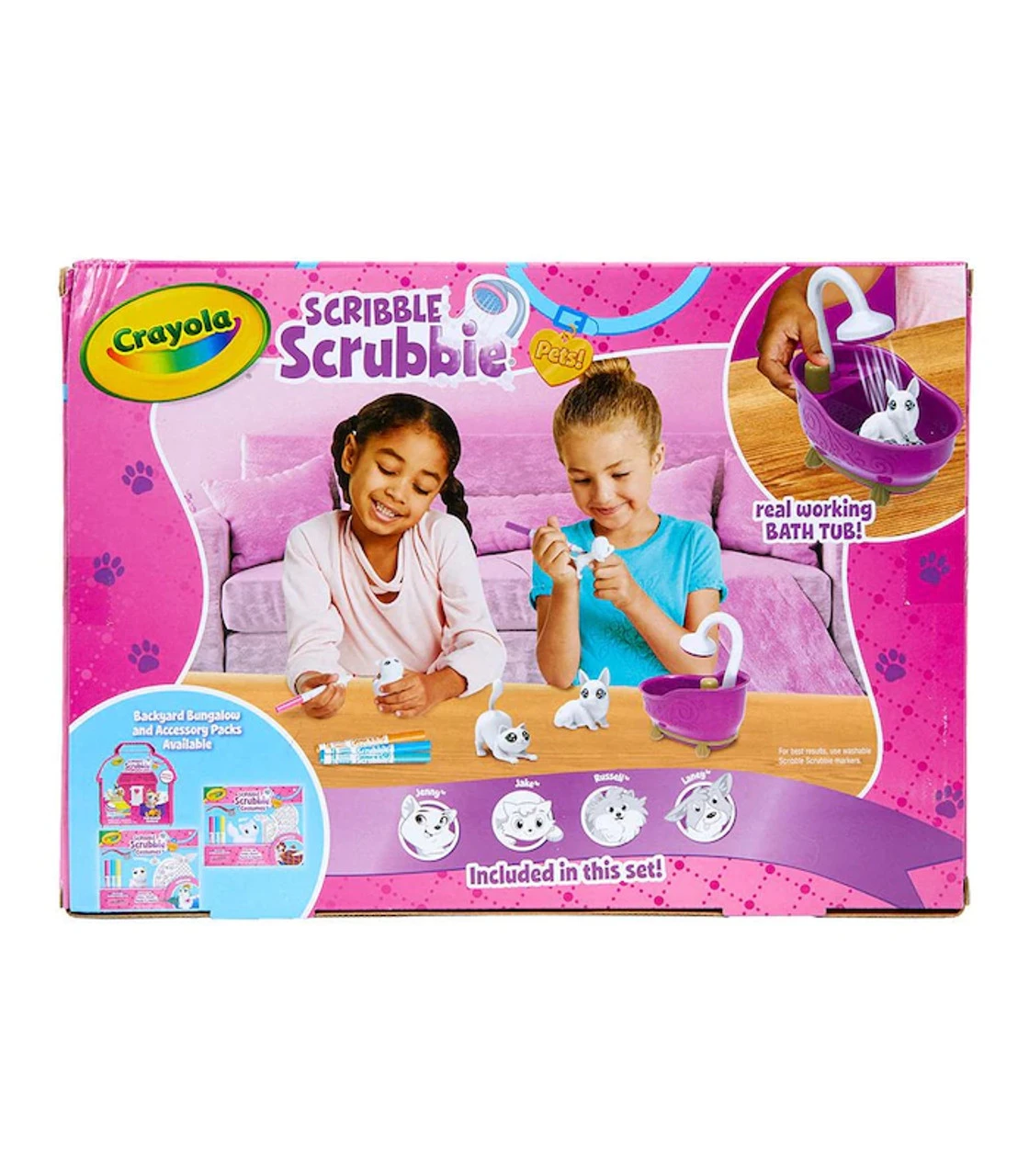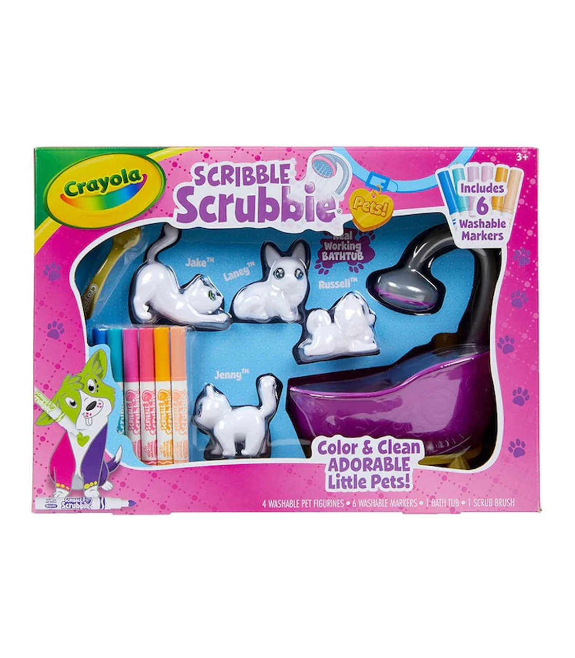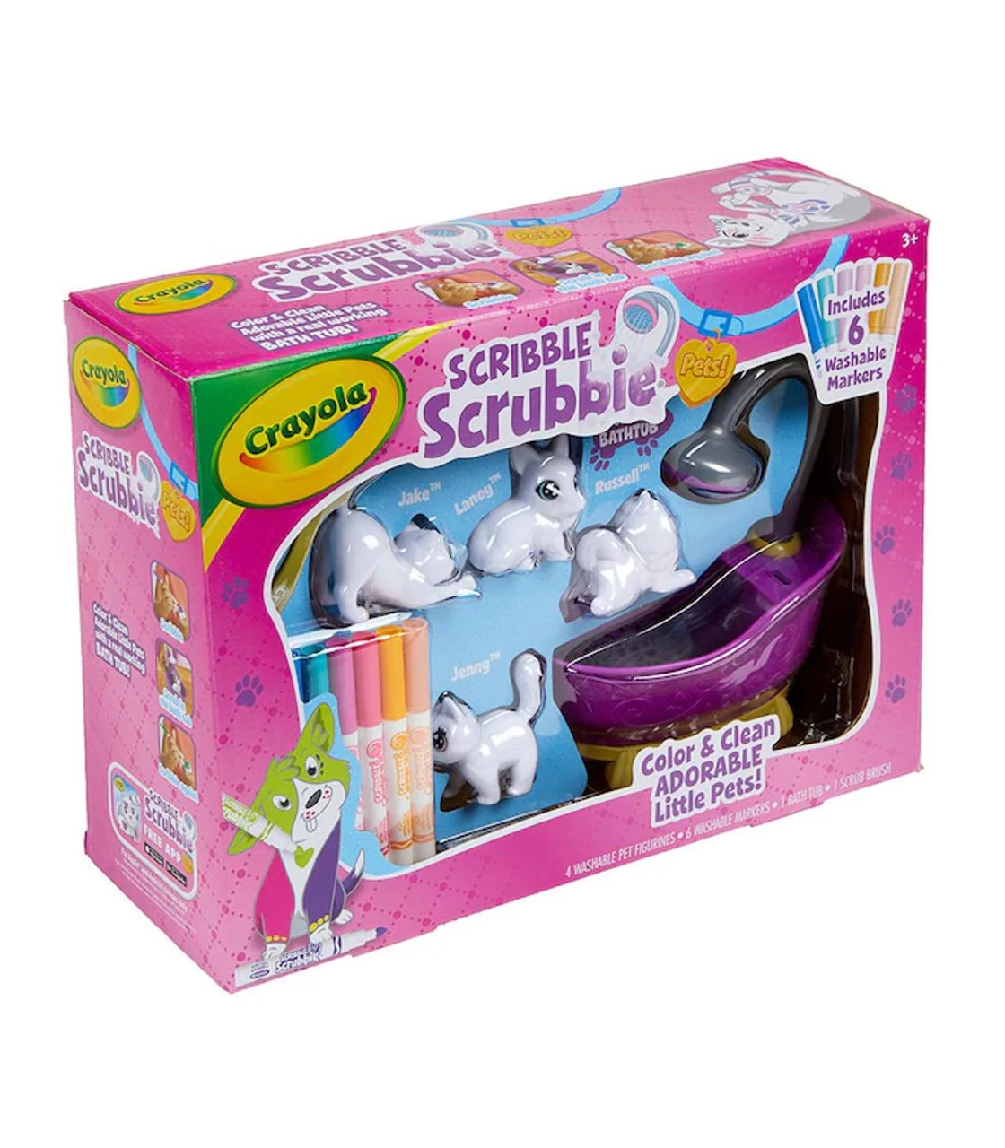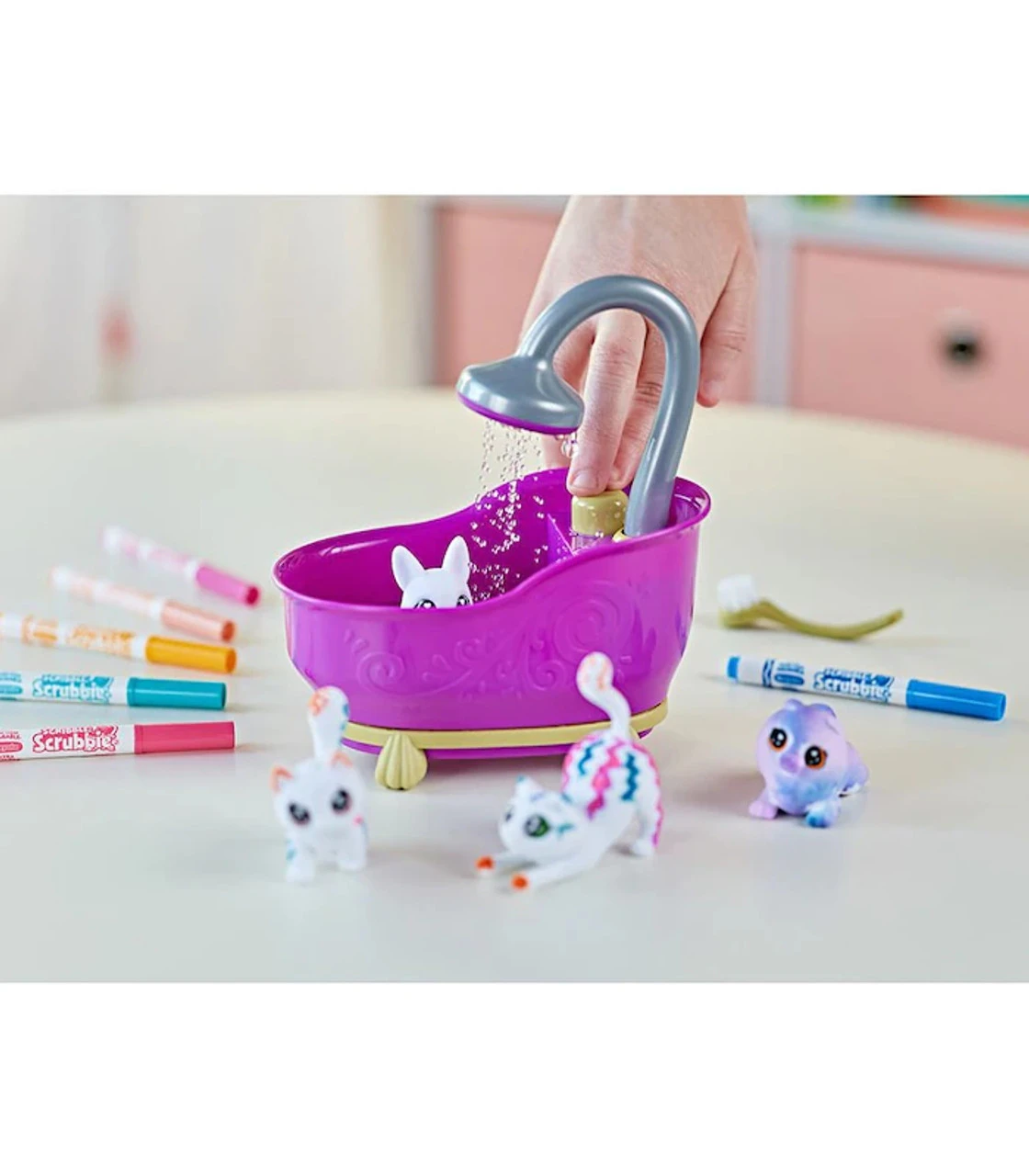 Splish splash in the bath with the Scribble Scrubbie Pets Tub 2.0! Set aside your traditional colouring books and choose a pet to colour instead of with 6 washable markers for kids. Just pick a colour and add unique designs to each adorable animal figure! When you’re ready for something new, POP ‘em in the purple scrub tub and use the scrub brush to get them cleaned up. Kids can even use the kid-powered shower to rinse their little friends in style! This fun toy for girls and boys comes complete with 4 animal figurines, 6 washable markers, 1 scrub brush and bathtub. For even more washable fun, kids can grow their Scribble Scrubbie squad with additional expansion packs (sold separately).