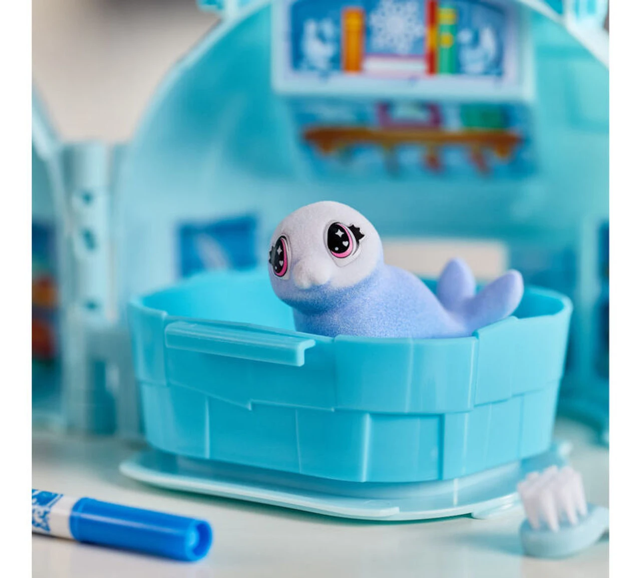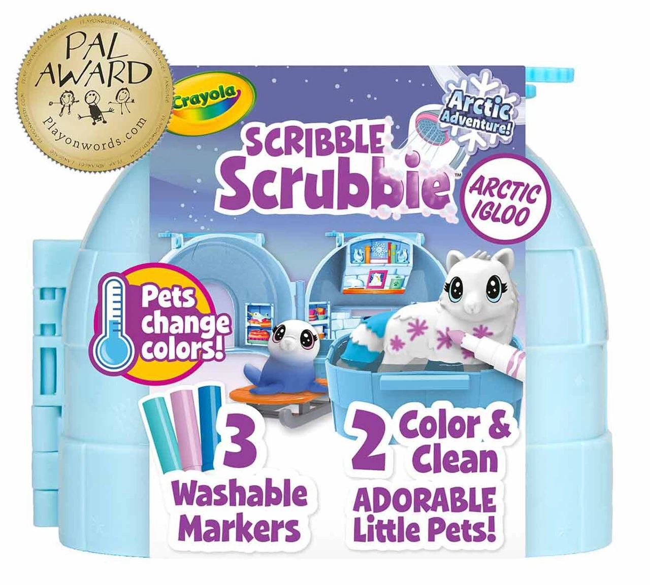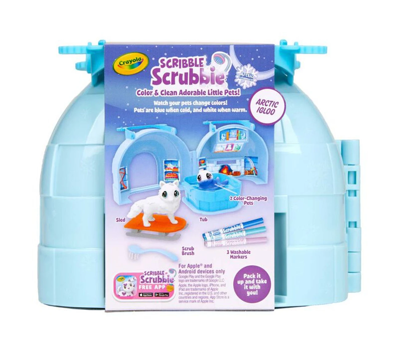 - CRAYOLA SCRIBBLE SCRUBBIE ARCTIC PETS IGLOO: Includes 1 plastic Igloo environment doubling as a storage case with foldable handles, 2 new colour change pets, 3 markers, 1 brush, and 1 plastic tub.