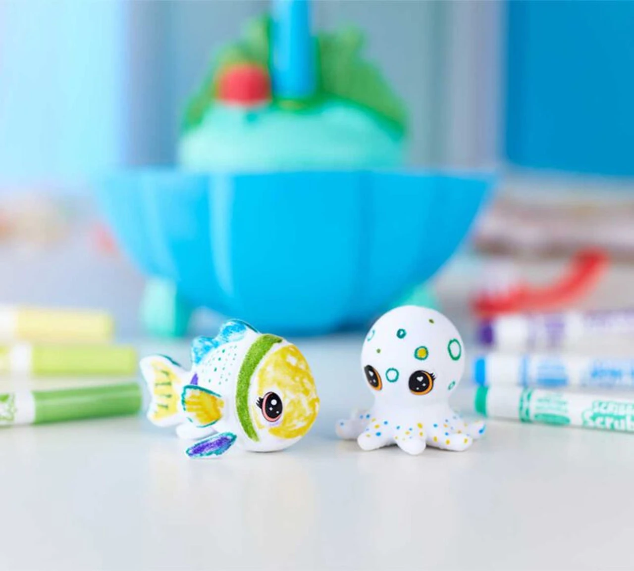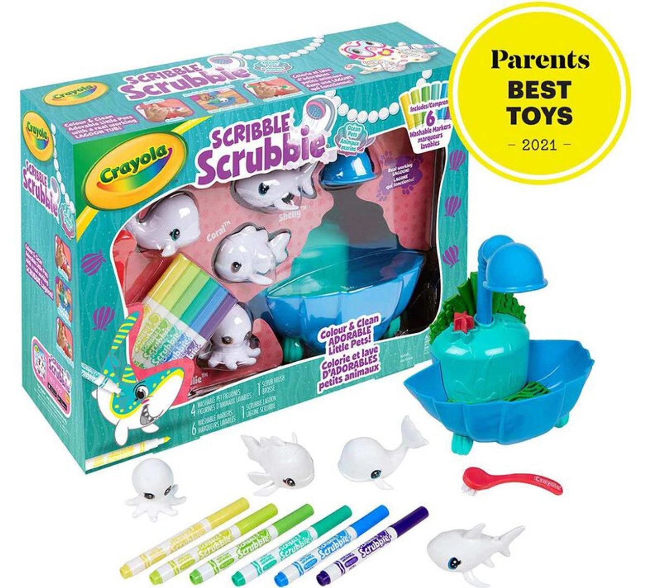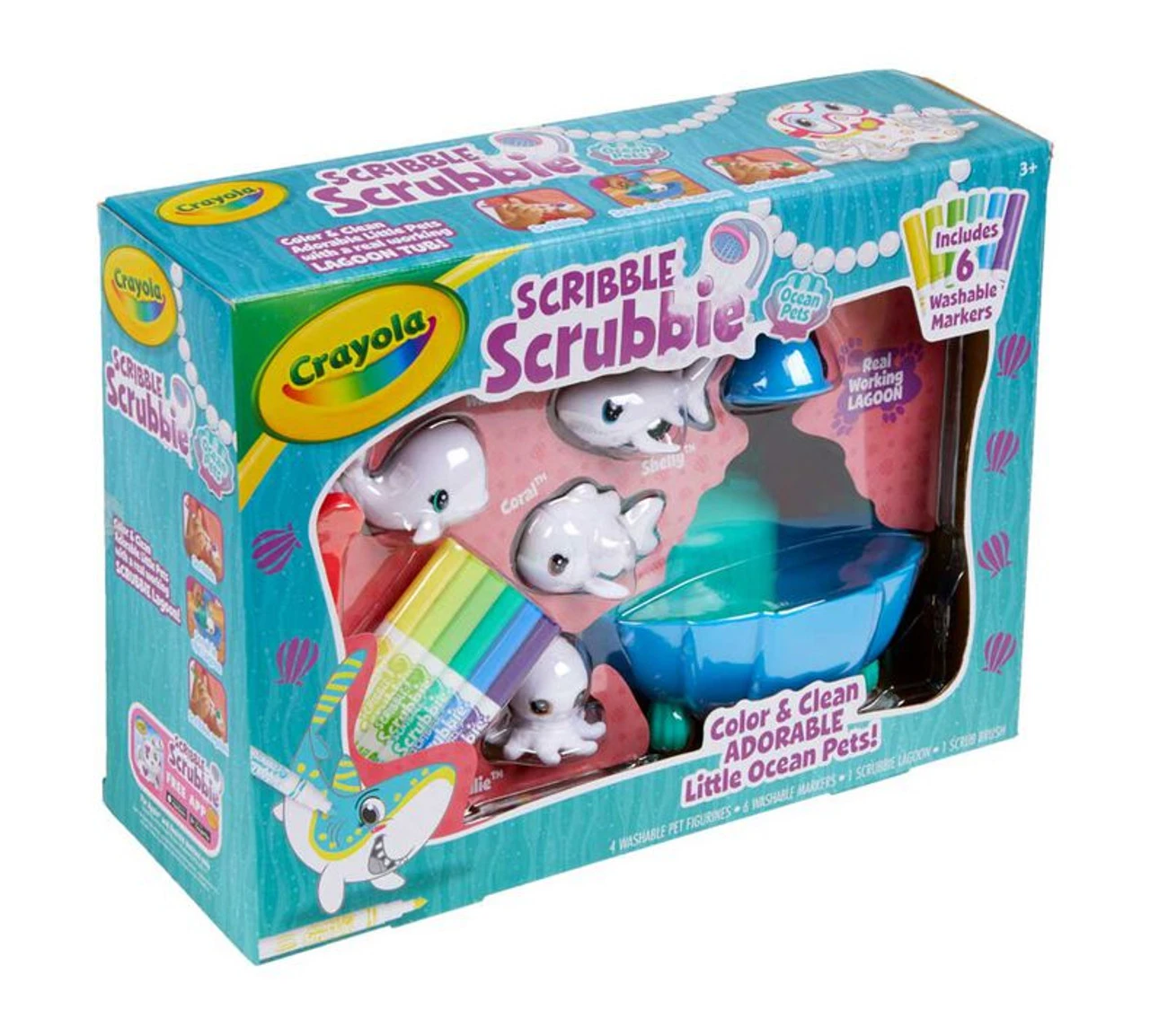 - SCRIBBLE SCRUBBIE PETS: Features 1 Blue Lagoon, 4 New Animal Figurines, 6 Washable Markers, and 1 Scrub Brush.