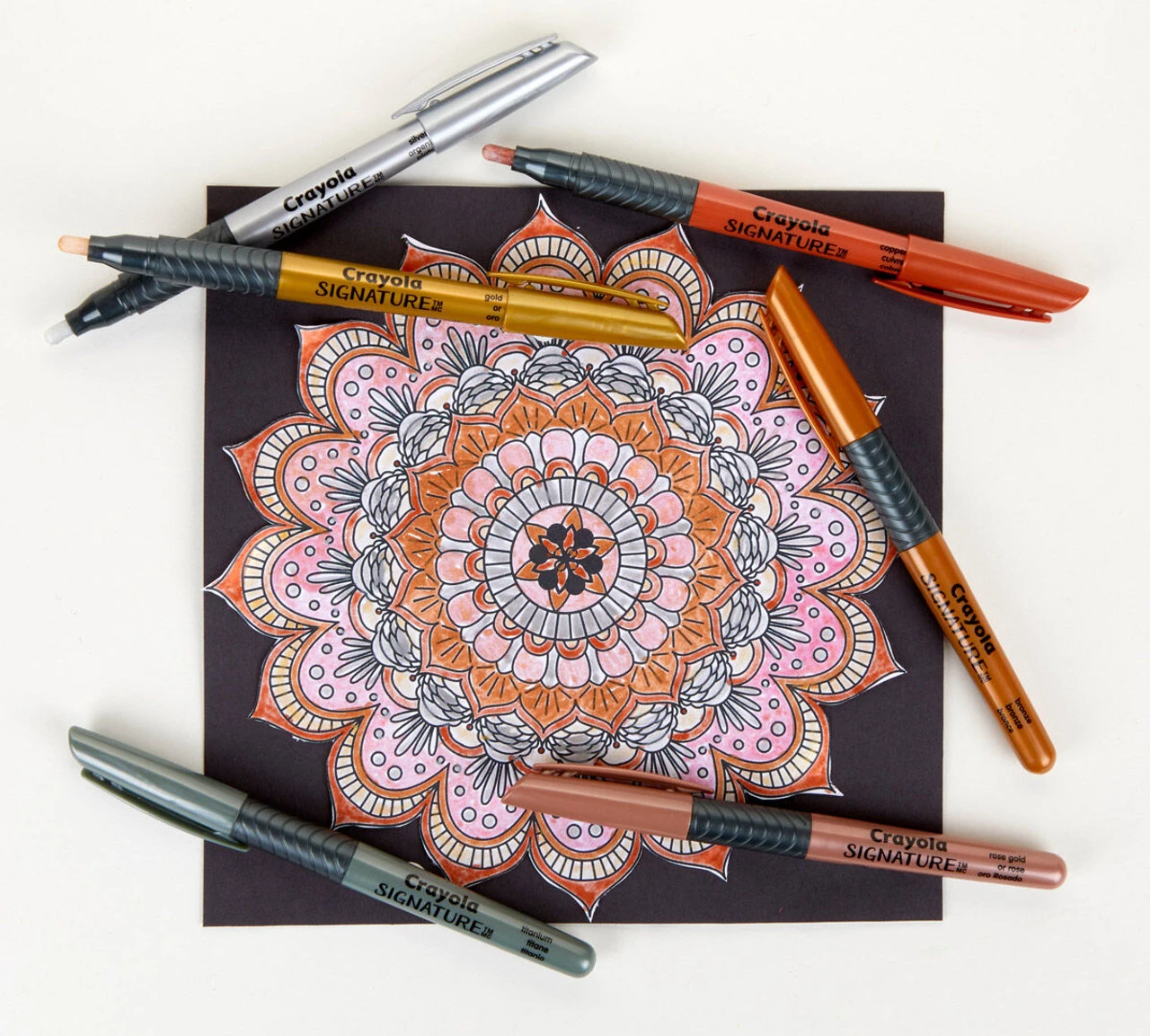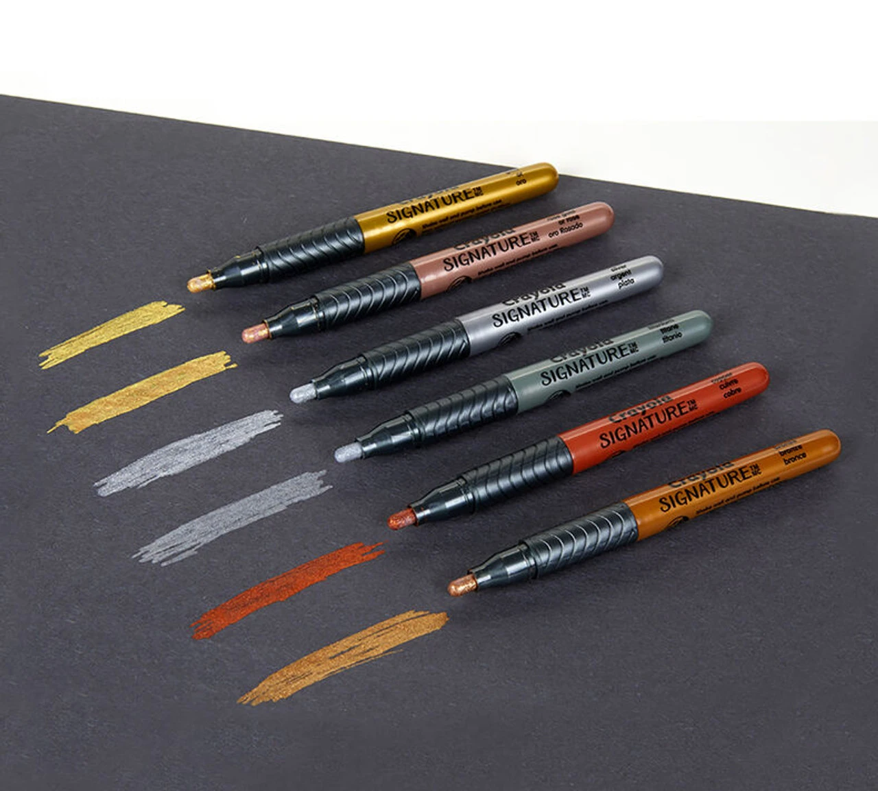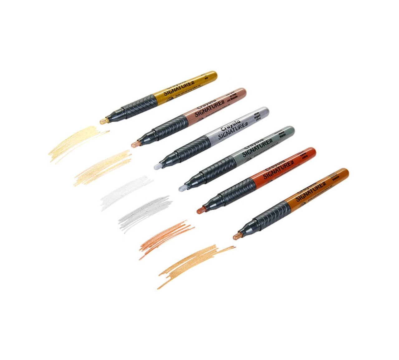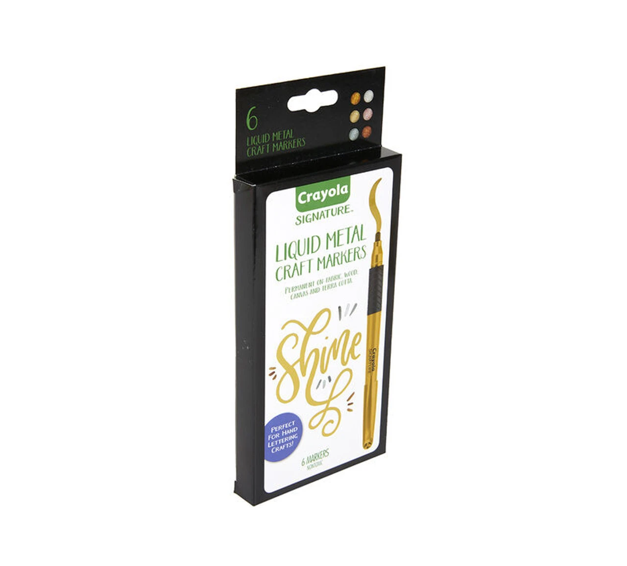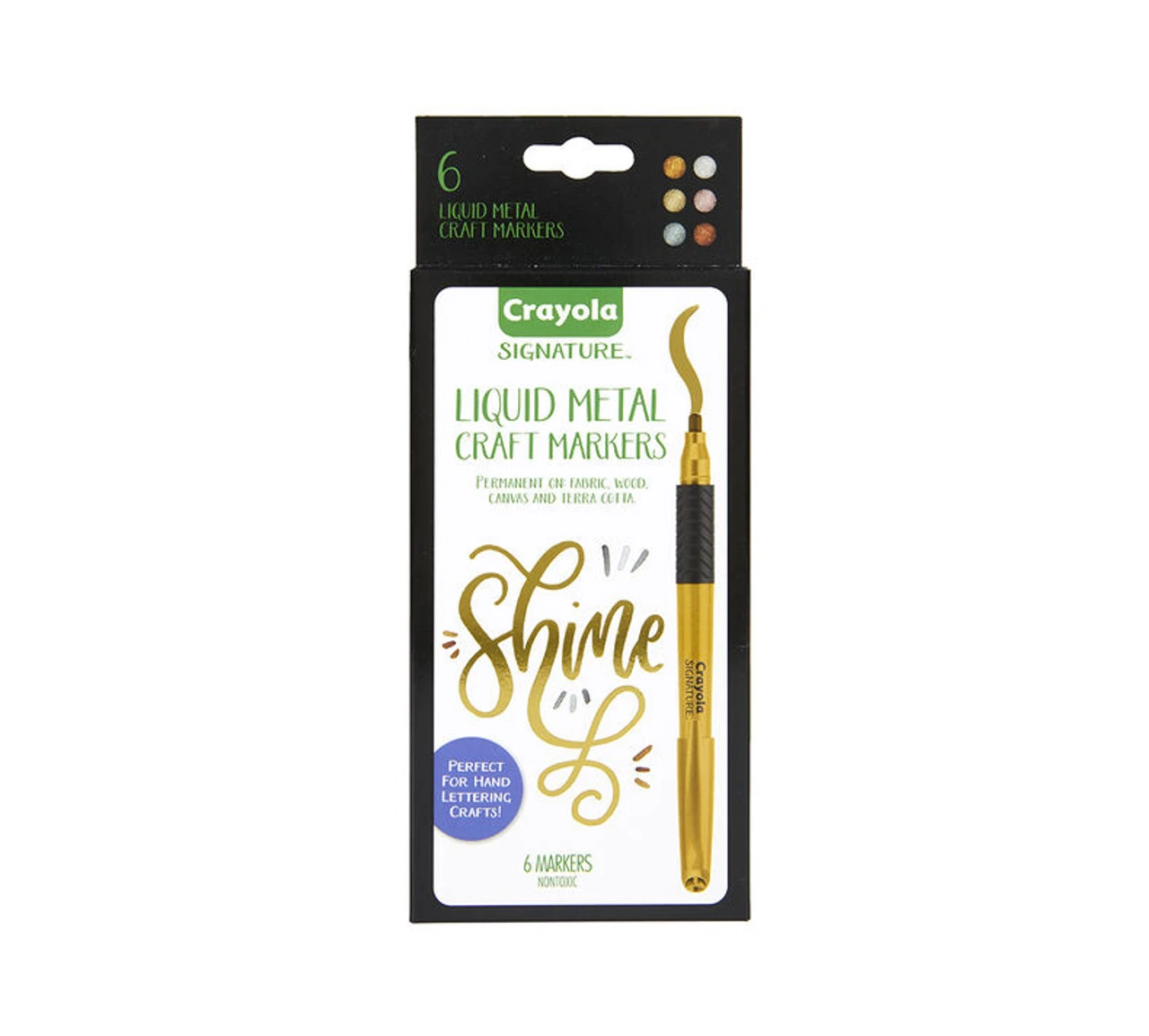 Crayola Signature Liquid Metal Permanent Art Markers add an extra sleek sheen to school projects, hand lettering, homemade cards, crafts, and other colourful art projects. Works great on poster board, foam board, regular paper, construction paper, wax paper, cardboard and even wood! Includes 6 Permanent Markers with paint-like inks and a liquid metal shine. Included colours are Gold, Rose Gold, Silver, Bronze, Copper, and Titanium. Ideal for teens and adults.