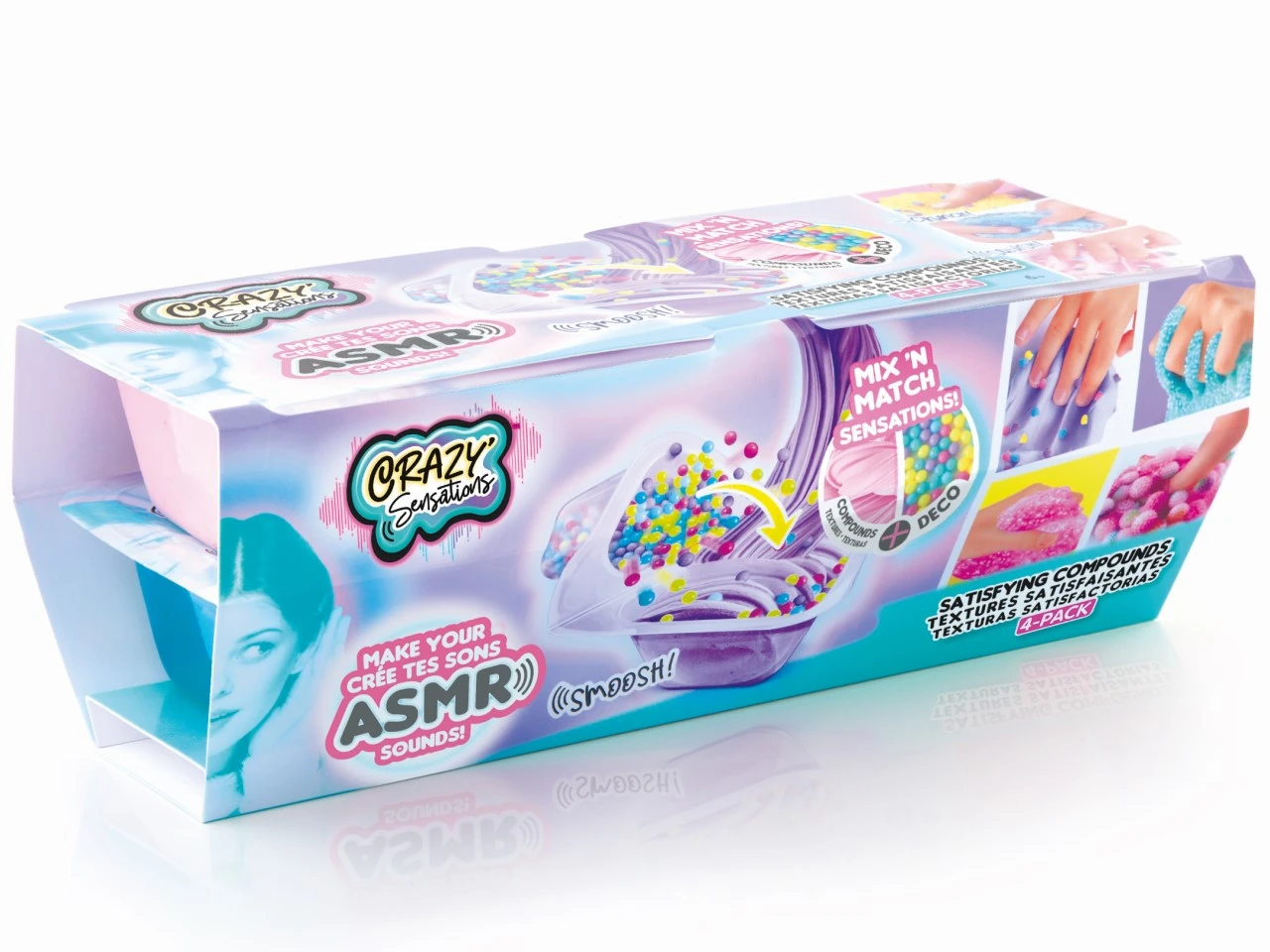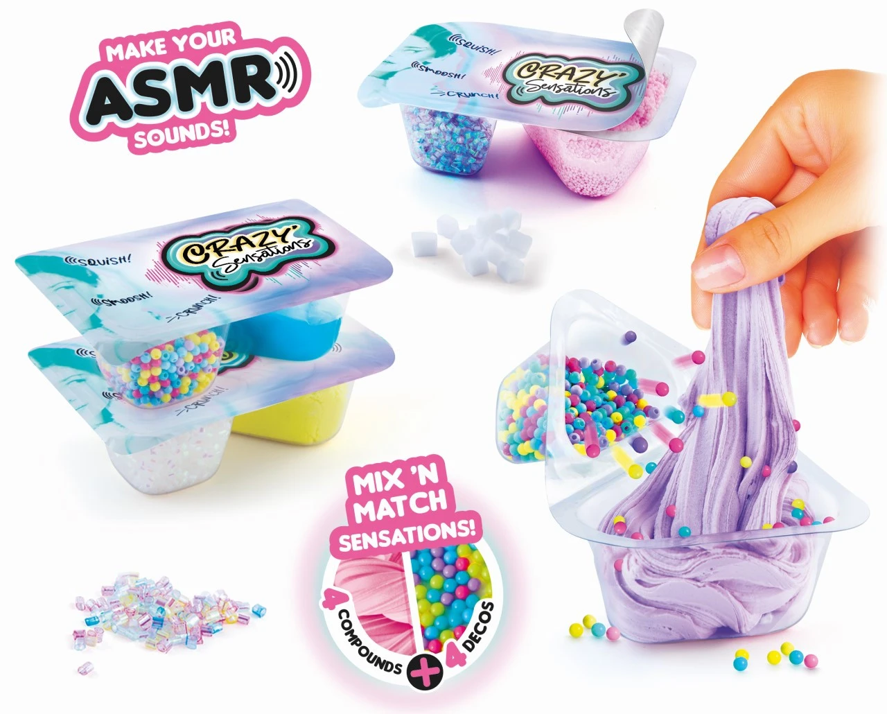 Open and discover a world of sounds and textures! Mix the decorations with the special compound to create uniquely satisfying sensations. Squish, pull and crunch and listen. There are twelve styles, see if you can collect them all! The special sensations provide feel-good vibes that are great for your well being!