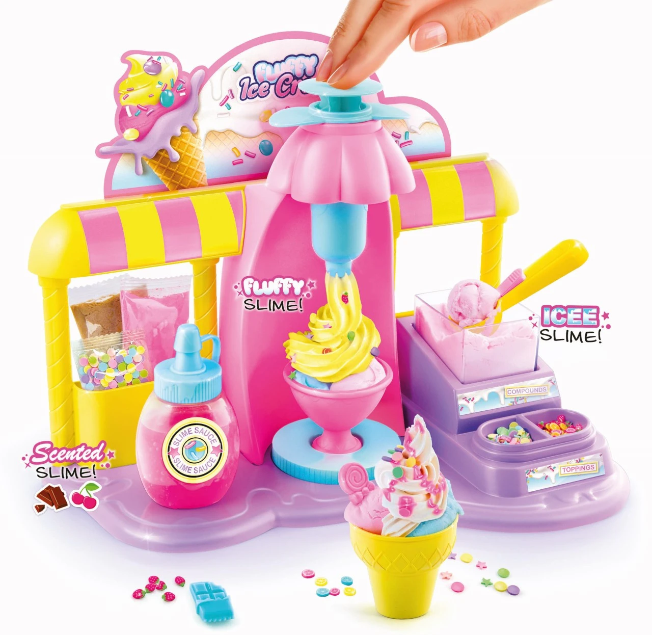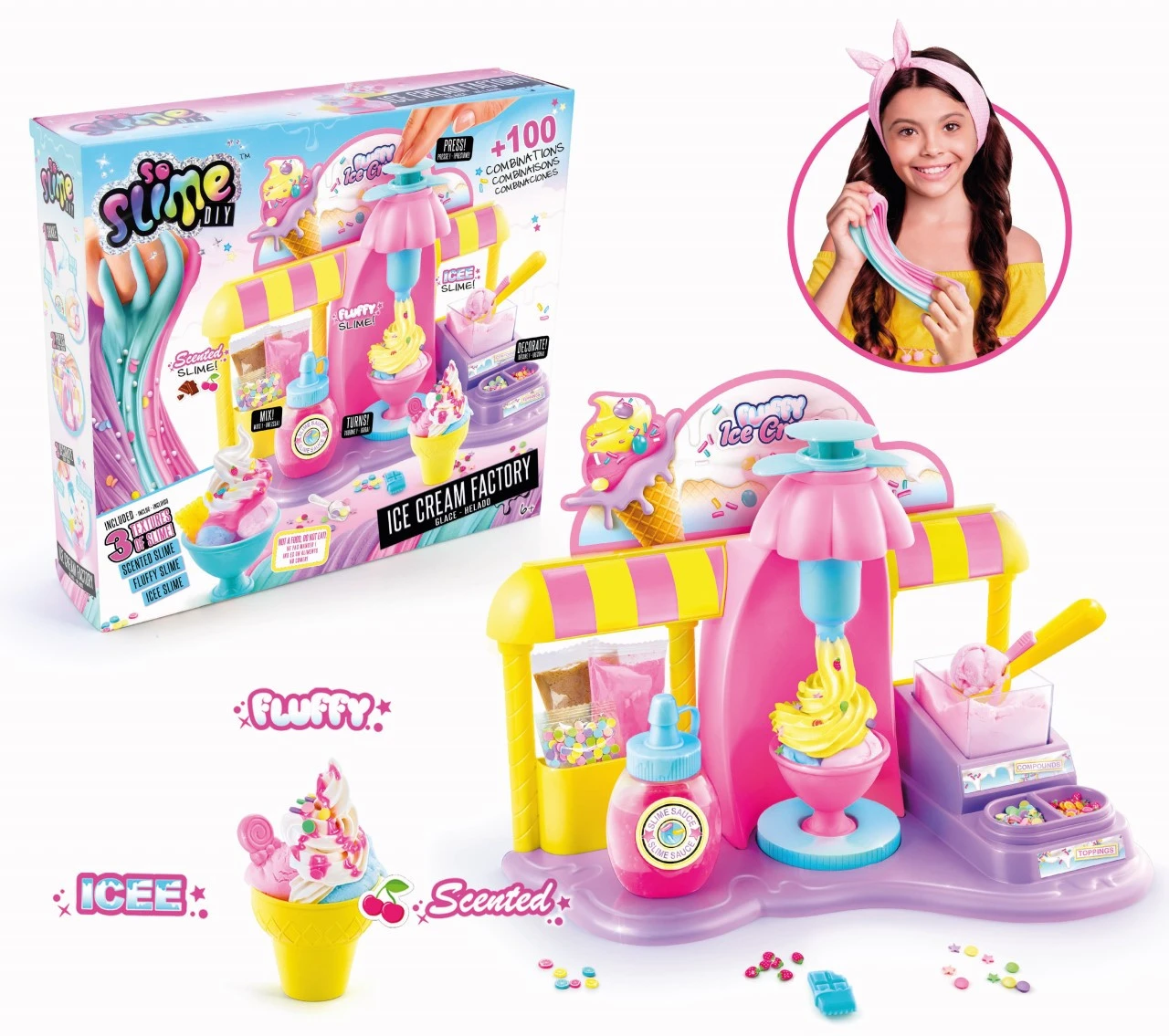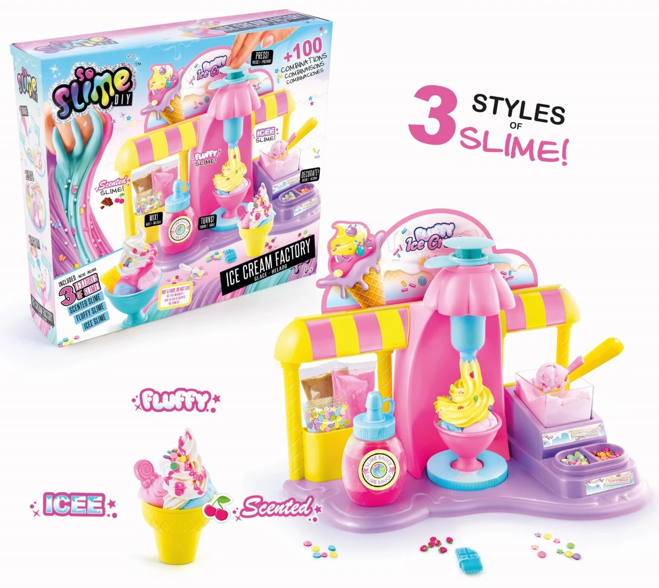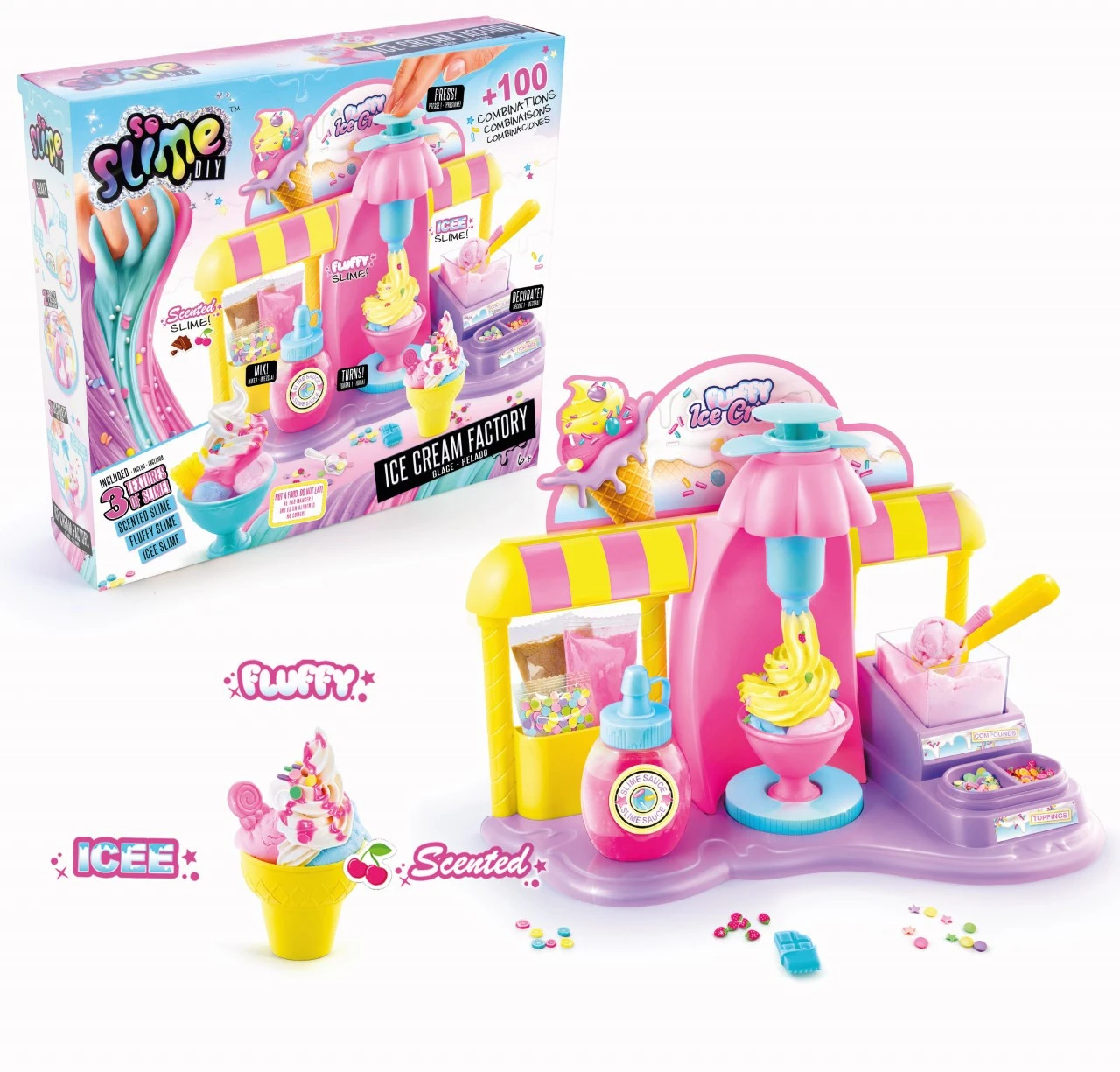 Make colourful and fun creations, with your very own ice cream factory. Making your own slime sundaes is so much fun with the Fluffy’licous Ice Cream Factory! Mix the compounds, squish and mould your ice cream sundaes, decorate and serve! There are three styles of slime! Scoop the Icee slime, add the squishy Fluffy slime and top with the wonderfully scented slime! So delicious, So DIY!