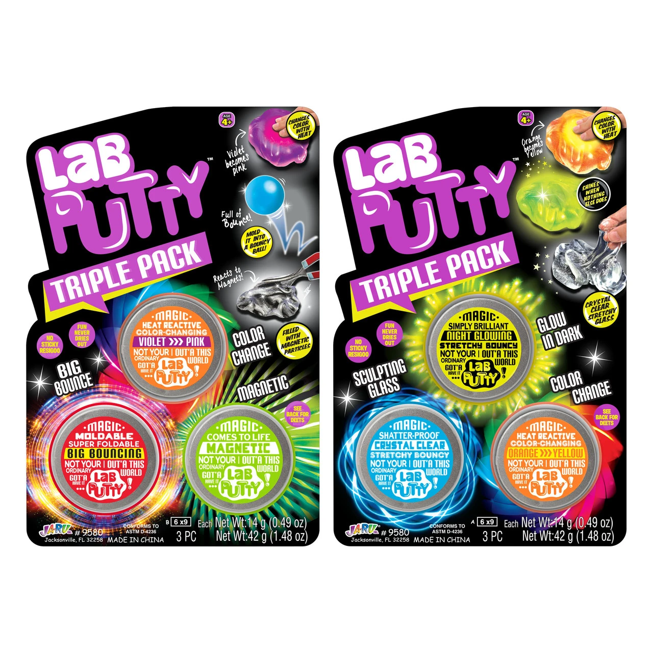 - Includes colour changing putty, big bounce putty, and magnetic putty OR glow putty, glass putty, and colour changing putty.