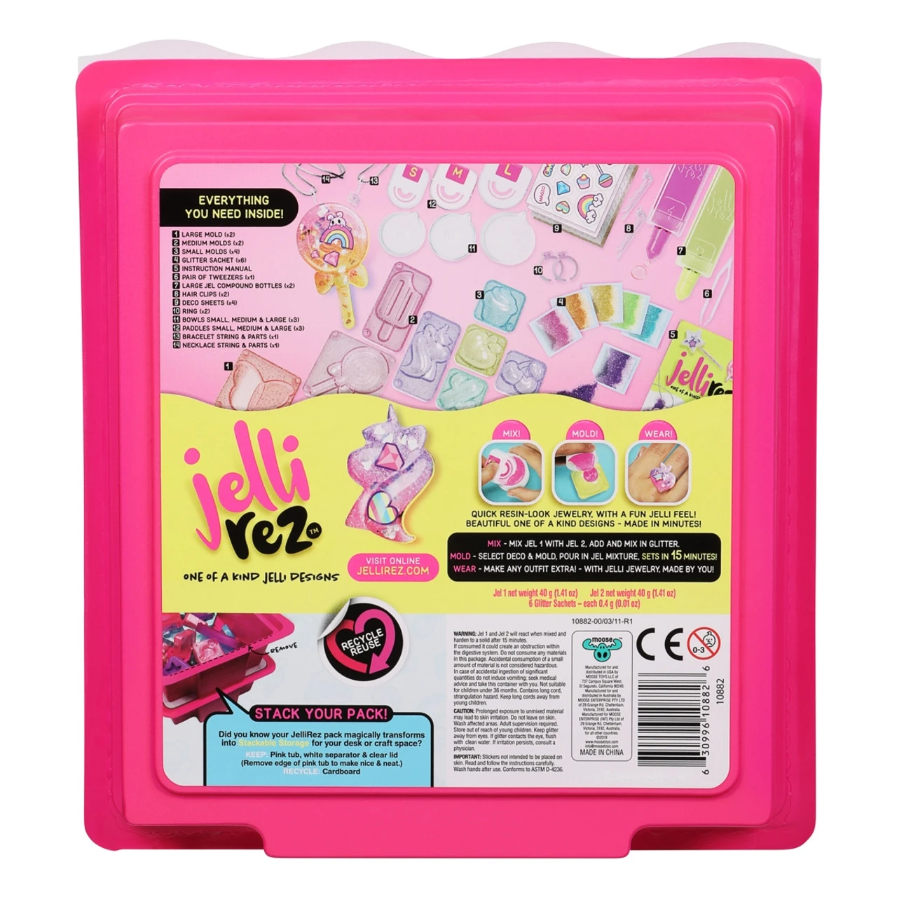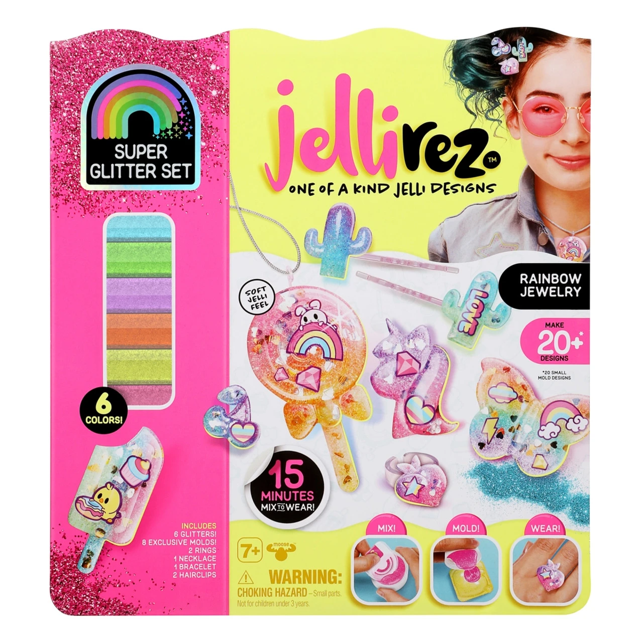 Jelli Rez lets you create one of a kind, resin-inspired designs using a fun and easy 3-step process that only takes 15 minutes – simply mix, mold, and wear!Unlike real resin, Jelli Rez air-dries naturally and safely in 15 minutes without the use of blue light.The Super Glitter Rainbow Jewelry Pack includes everything you need to make up to 20 unique jelli designs. Mold designs include: lollipop, popsicle, unicorn, butterfly, cupcake, peach, cactus and cherries.This pack also comes with 6 sparkly glitter colors including: purple, pink, orange, yellow, green and blue – so that you can make one of a kind jelli designs in all the colors of the rainbow!Create rings, necklace, bracelets and hair clips that you can wear, or share with your besties!