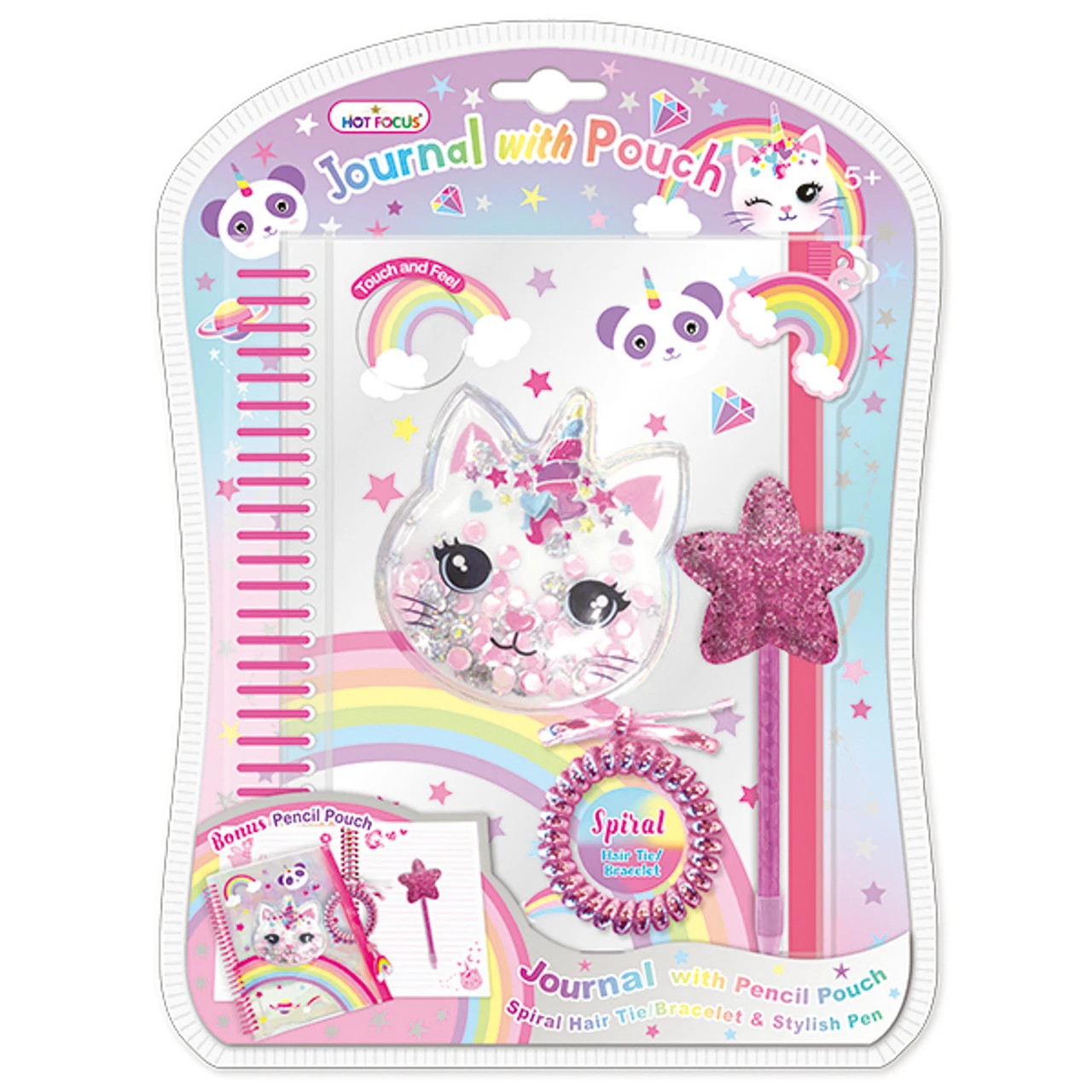 Totally cute stationery set!Comes with a nice journal with pencil pouch to keep your stationeries organized. Stylish glitter star pen is perfect for hours of writing fun.