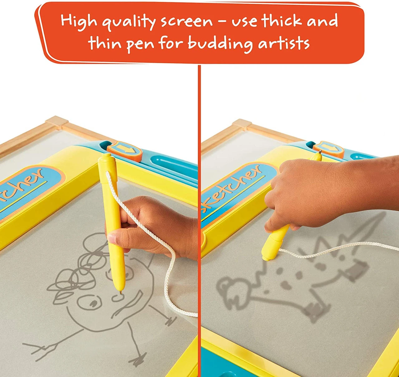 - HIGH ACCURACY SKETCH PAD – Mess-free magnetic drawing board with easy-carry handle. Draw fine and thick lines with the attached pen and encourage unstructured creativity on your little one by sketching different shapes, animals, numbers and letters
