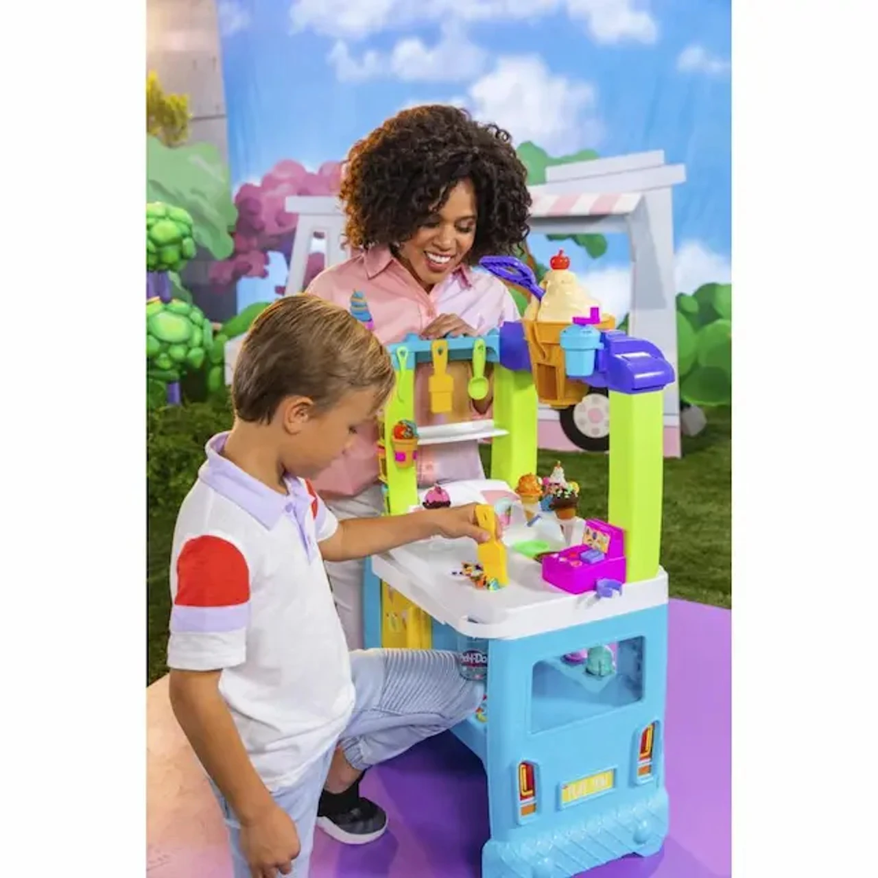 Turn your play space into the ultimate Play-Doh ice cream truck party! This life size kitchen set gives kids a big space to express their big imaginations. Create so many pretend treats with the 27 tools and soft-serve station, customize the creations with the Play-Doh sprinkle maker, tools, and pretend candy molds, and check out customers at the register. Fun music and cash register sounds make kids feel like they’re really running their own ice cream truck. 12 cans of Play-Doh modeling compound give them all the colors they need to get started. The toy food truck was also designed with parents in mind with lots of storage and easy ways to clean up when the fun is done for the day! Hasbro, Play-Doh, and all related properties are trademarks of Hasbro.