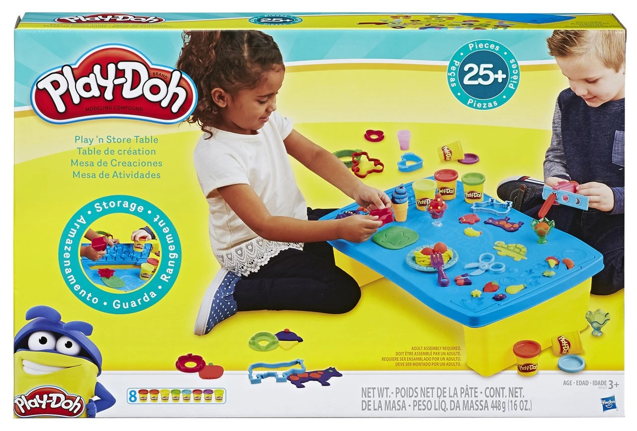 Enter the imagination zone! With this handy table, kids have a place to play and store their Play-Doh cans and tools. This all-in-one creative activity table is great for kids to explore and share the silly fun together. With built-in half-molds, 8 Play-Doh cans, and more than 25 tools, there’s plenty of hands-on play to go around! Make basic shapes and animals with the cutters, whip up some Play-Doh ice cream treats with the extruder and dishes, and so much more. When the fun is done for the day, drop the tools and cans into the hinged doors for easy storage!;