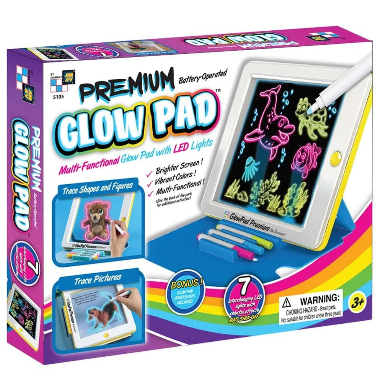 Comes in a nice package, complete with 3 special window markers, Glow Pad Case/Easel. Different color backgrounds for tracking.