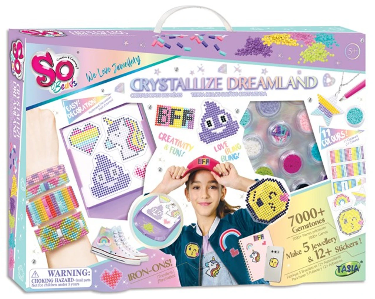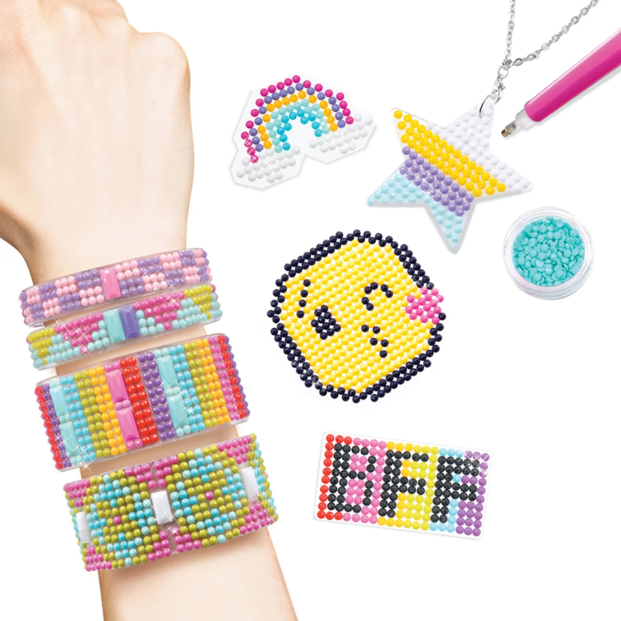 This Gemstones Painting Kit comes with 7000+ Gemstones, Bangles, Metal necklace, Charm, Reusable containers, Crystallizing tool, Tray, Wax, Pattern sheets, Double-sided adhesive sheets, Iron on transfer sheet, Manual. Everything that is needed to make 5 Jewellery & 12+ Stickers! You can also make your own designs of the gems painting patterns!