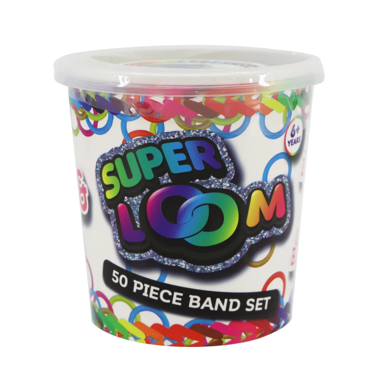 Super Loom 50 piece band set Thicker & Squishier! Giant Loom Bands Comes in a range of bright colours Let your creativity shine! Super Loom bands are super stretchy! Make Backpack clips, bracelets and more!