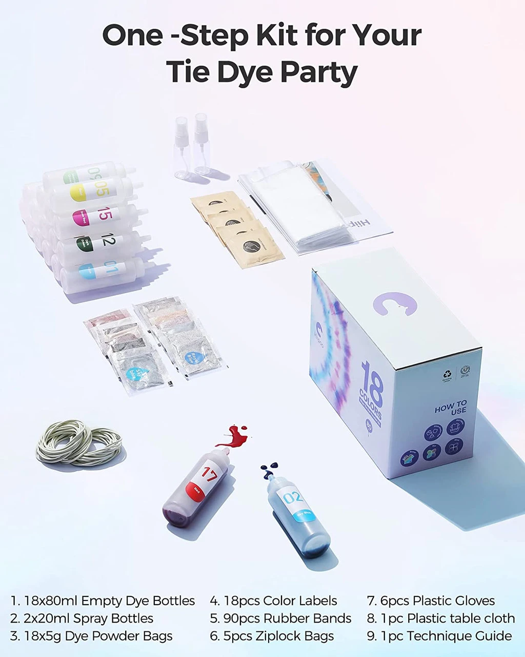 Complete Tie Dye Kit: Hiipoo tie dye kits include 18pc 80ml Empty Dye Bottles, 2pc 20ml Spray Bottles, 18pc 5g Dye Powder Bags, 18pcs Color Labels, 90pcs Rubber Bands, 5pcs Ziplock Bags, 6pcs Plastic Gloves, 1pc Plastic table cloth, 1pc Technique Guide. Large capacity kit and over 6 tie-dye techniques for your creative activities.
