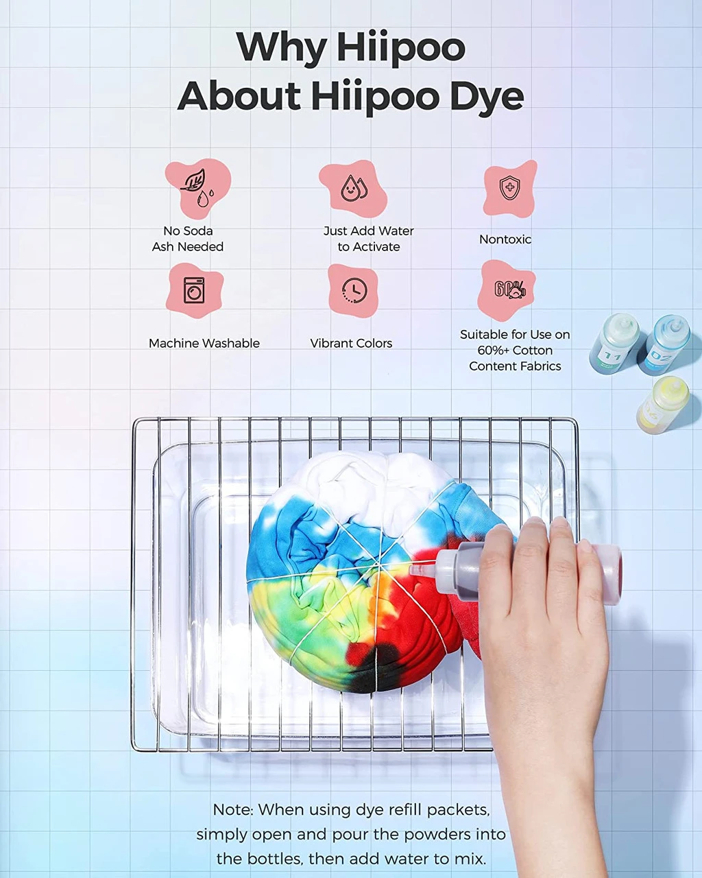 Vibrant Colors and Machine Washable: Unlike other tie dye kits at present market, Hiipoo versatile, easy-to-use and non-toxic powder dye is ready to deliver vibrant color to fabric with 60% or more cotton. To ensure bright colors, place the fabric in a ziplock bag for 24 hours after the first tie-dye, then rinse with cold water and air dry.