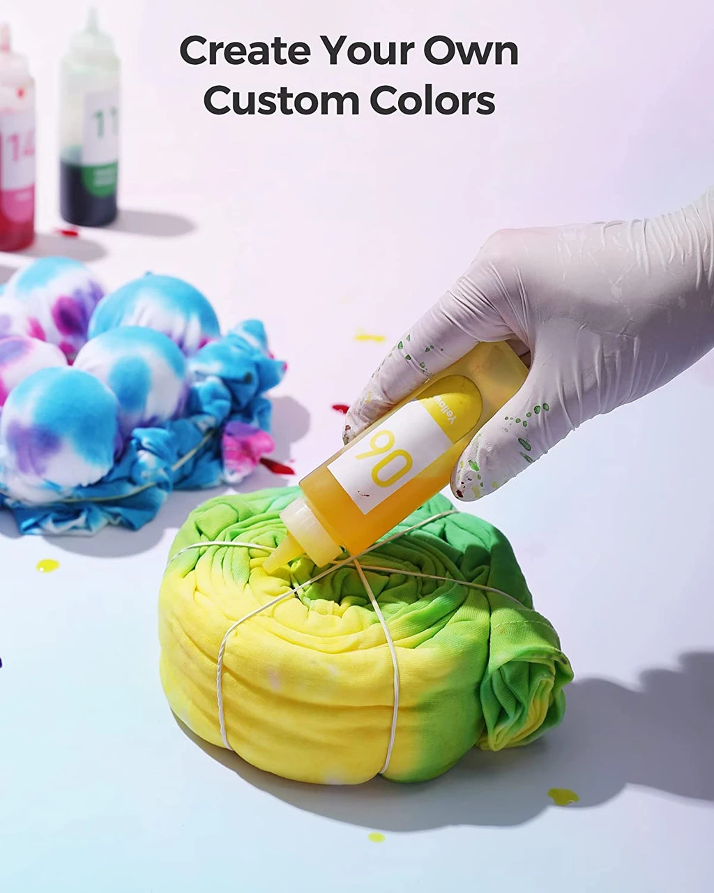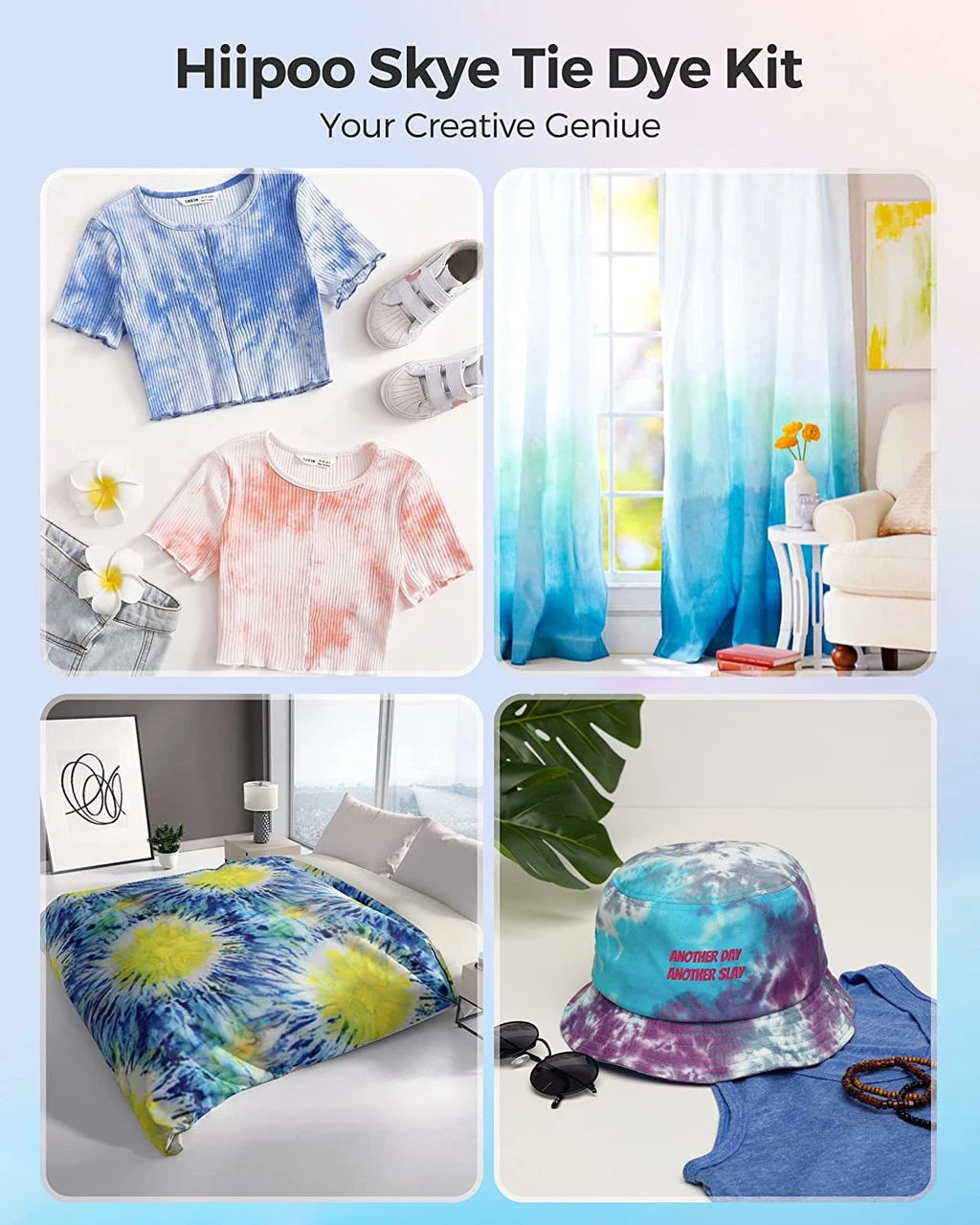 Create Your Own Custom Colors: The Hiipoo technique guide gives you 6 different types of tie-dye that you can create your t-shirts, dresses, shorts, shoes, socks, hats, pillowcase, handkerchiefs, tablecloths, curtain and more. Each powder bag and bottle has a color label to help you find your color quickly, making it easy to create a design-filled tie-dye crafts.